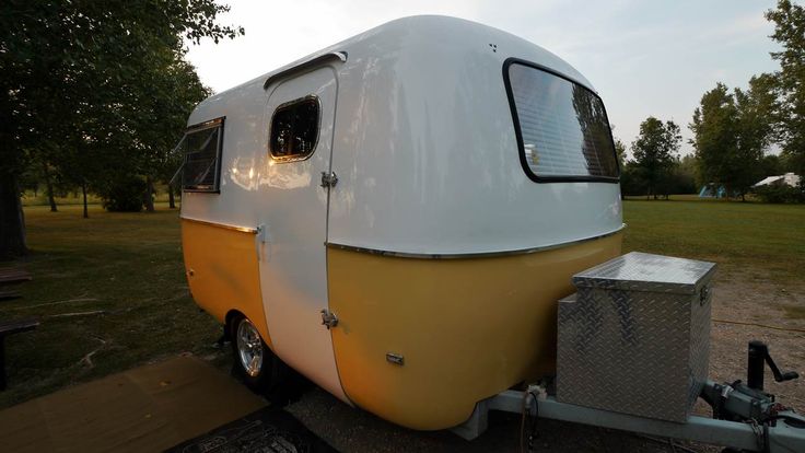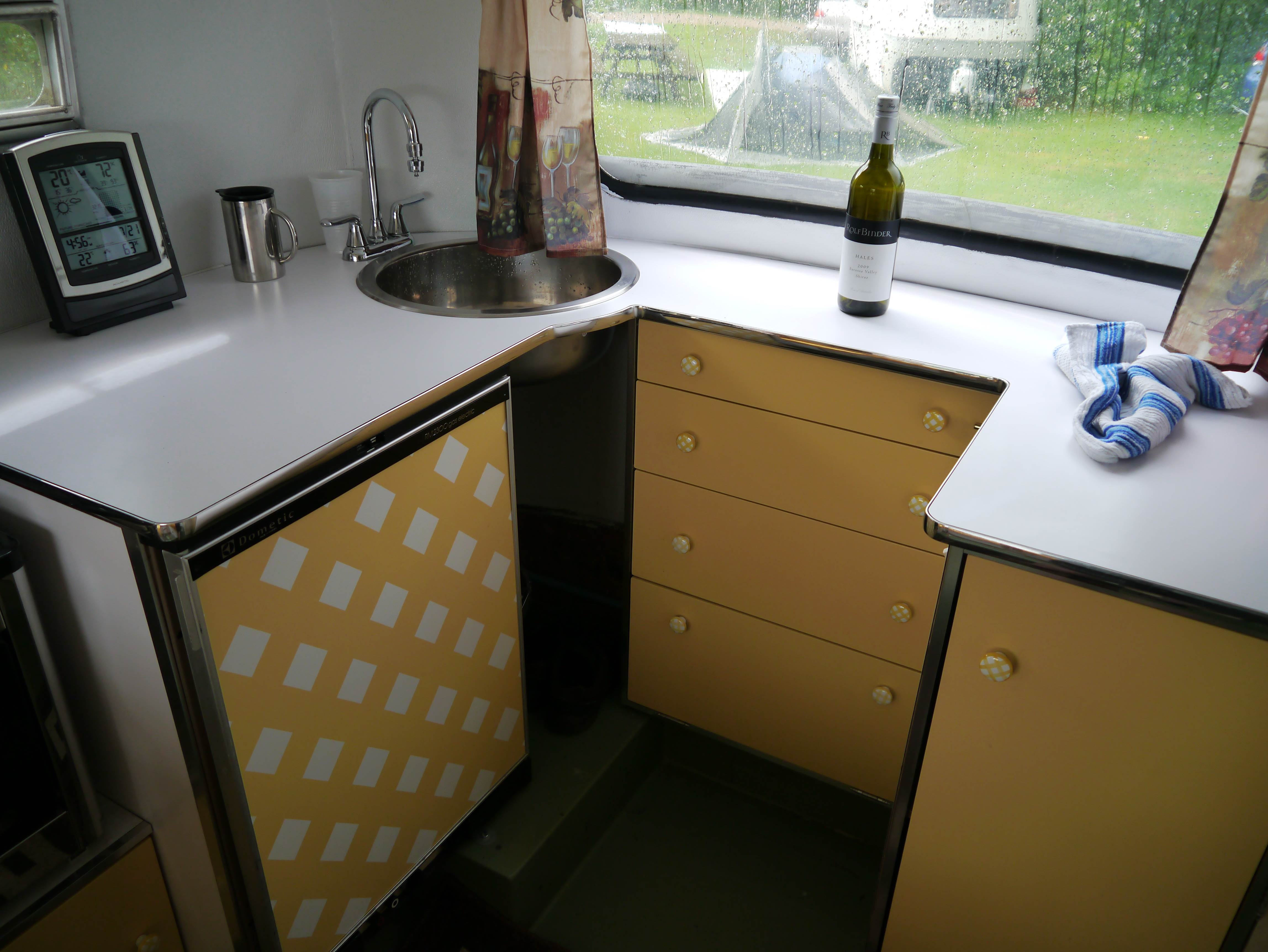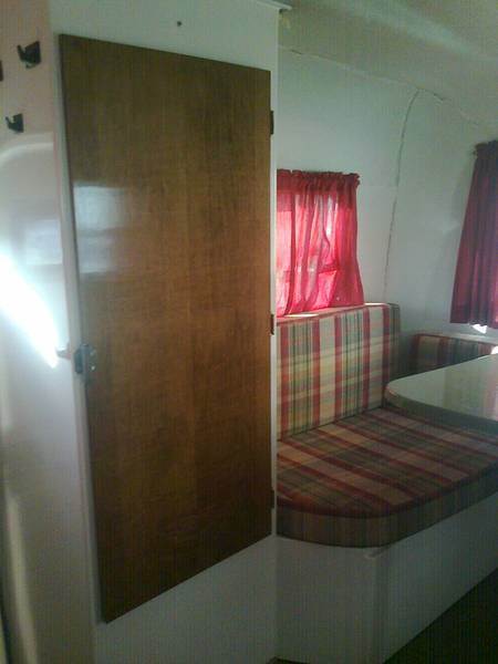 Window coverings are the one item that is easy to change and make a considerable difference in the decor in the Boler. We initially started out with curtains with a wine motif, these worked great but I didn’t like that they always covered part of the window edges and did reduce the bright airy feeling. These were changed to white vinyl venetian blinds, the look was transformed to a much more modern and lighter look. I updated the interior side window molding first with wood molding painted yellow, I didn’t like this so it was immediately change to 1½” wide anodized aluminum, the look it currently has.