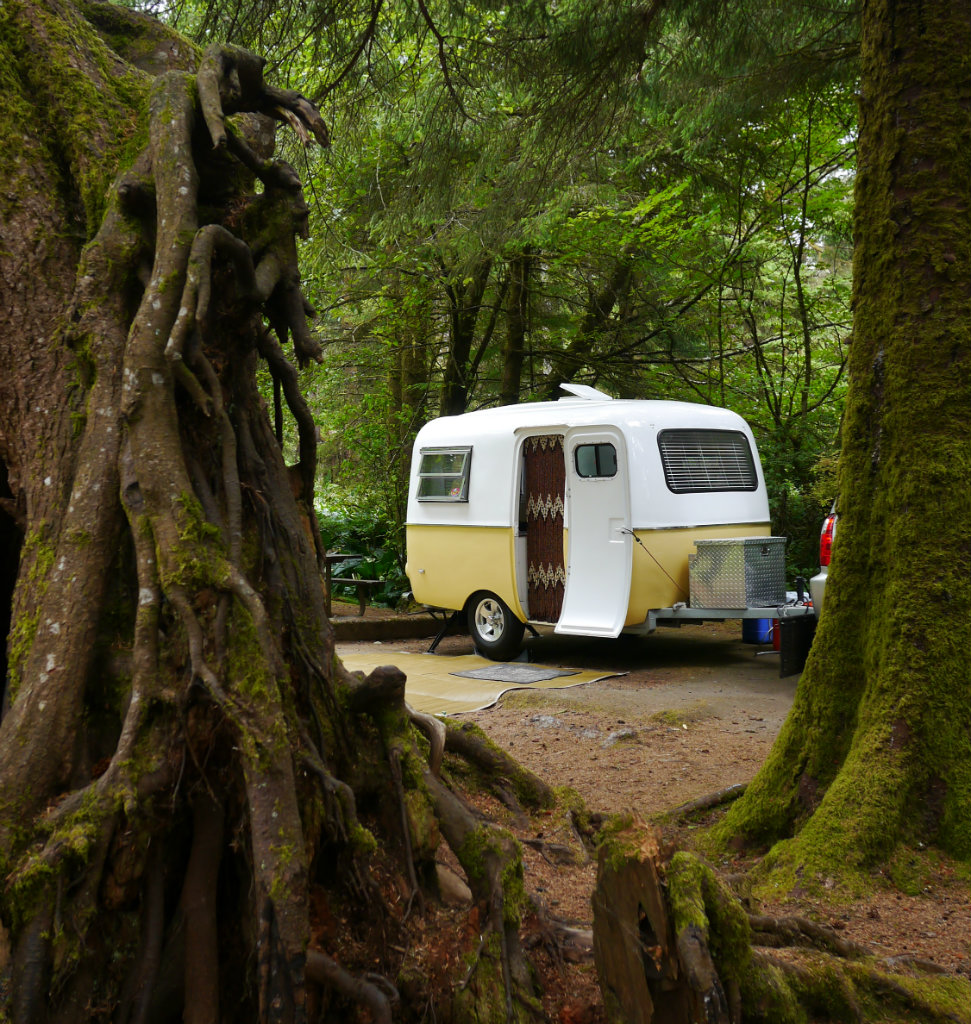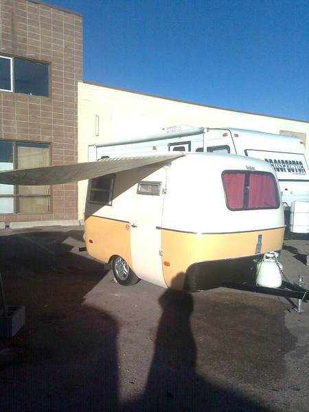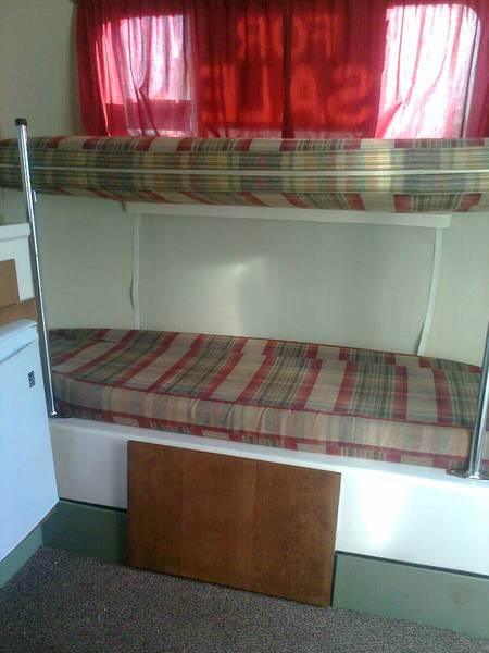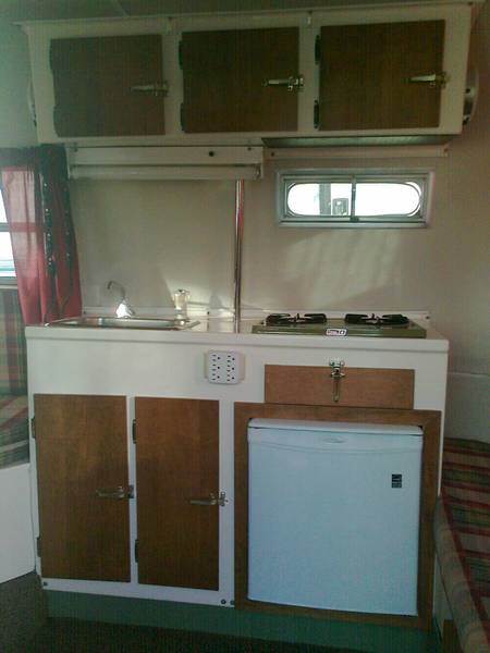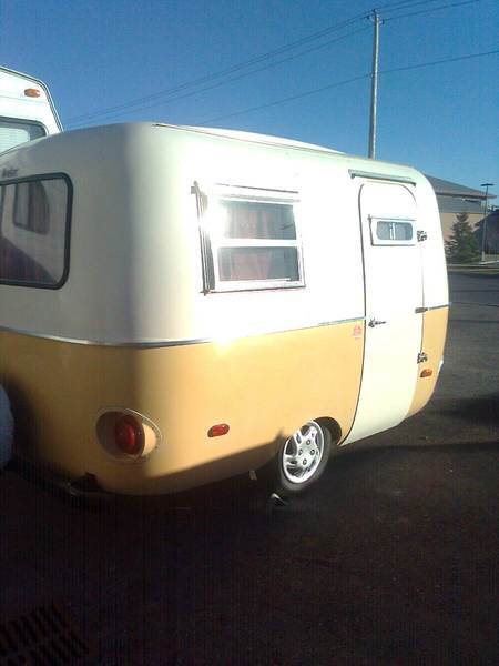 Although the outside looks relatively stock and retro the inside reveals a completely unique custom floor plan; the dinette area was widened by 10” to form a “U” seating with a large 34″ square table which converts into a true 54” double bed. The brilliant white kitchen counters feature a full size round corner sink and chrome edging. Appliances include a two burner stove with oven, 3 cu/ft fridge with a hand painted front panel that matches the drawer knobs, There is plenty of storage with 4 large drawers in the front under the window, a large storage cupboard under the wrap around counter, the closet has been moved into the front corner. The final touch is the built in wine rack which slides sideways to reveal the electric water pump and hot water heater. Beside the main entry door is a small cabinet with one drawer and a custom tilt out that conveniently holds the portable toilet.
