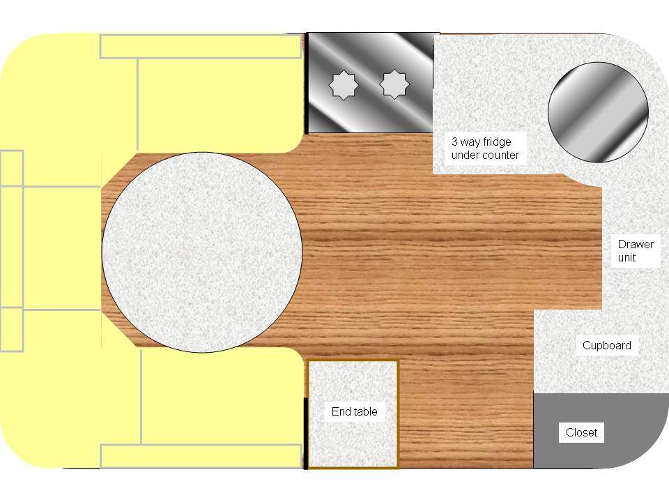 I am not much for making detailed sketches or CAD drawings, my plans are usually ideas and visions in my mind, maybe quick sketched on the back of a napkin along with some measurements. I actually went into great detail on this project by roughing out some design ideas in the program I am most comfortable with PowerPoint. Many will laugh, and that is OK, it works for me. The final design really excited me; a front closet, a “U” shaped kitchen with corner sink, 5’ of counter with a stove and oven. The bed would be 8” wider than the original at 54” and convert into a “U” shaped dinette. A small side cabinet just inside the door would hold the porta-potty and provide a bedside table.
