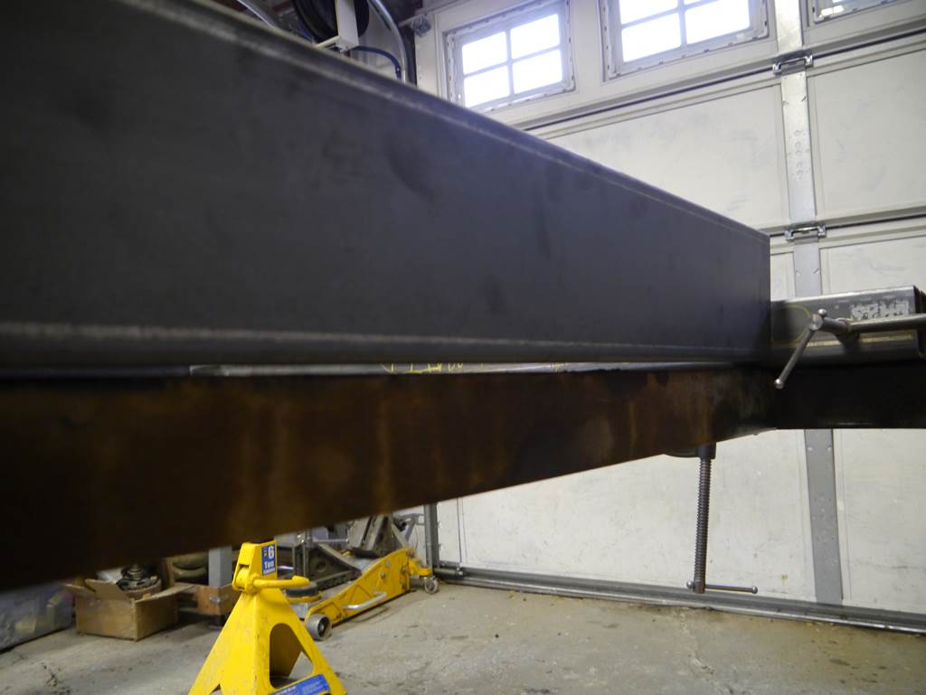 With the plan made to fix up the entire trailer and build a completely new interior I wanted to make sure the foundation (or frame) was solid and straight so I decided it was worth the extra effort to remove the body from the frame and take a real close look. The body was held on with about 6 bolts and a series of wood screws drilled right into the frame … and every single bolt and screw was either loose or had already fallen out. With the body shell off the frame it was immediately noticed that there were major problems with the frame. The original frame was not in good shape, from the Boler factory most of the cross members were only welded on the sides not the top or bottoms, the remaining welds were very poor quality. The metal used on the frame was very thin comprising of 1.5”x3” box channel 1/16” thick. Sometime in the past the frame had broken where the tongue joins the left side rails, this had been reinforced and repaired. The main left frame rail had a cracked right near the axle mount and there was a noticeable bend down from the axle to the back bumper. I think the cause of this was because the body was actually rocking on the frame due to the fact that all the bolts were loose. If you remember when we first bought the trailer there was a bulge and cracked gel coat on the left side, the bent frame was actually twisting the entire body shell and distorting it.