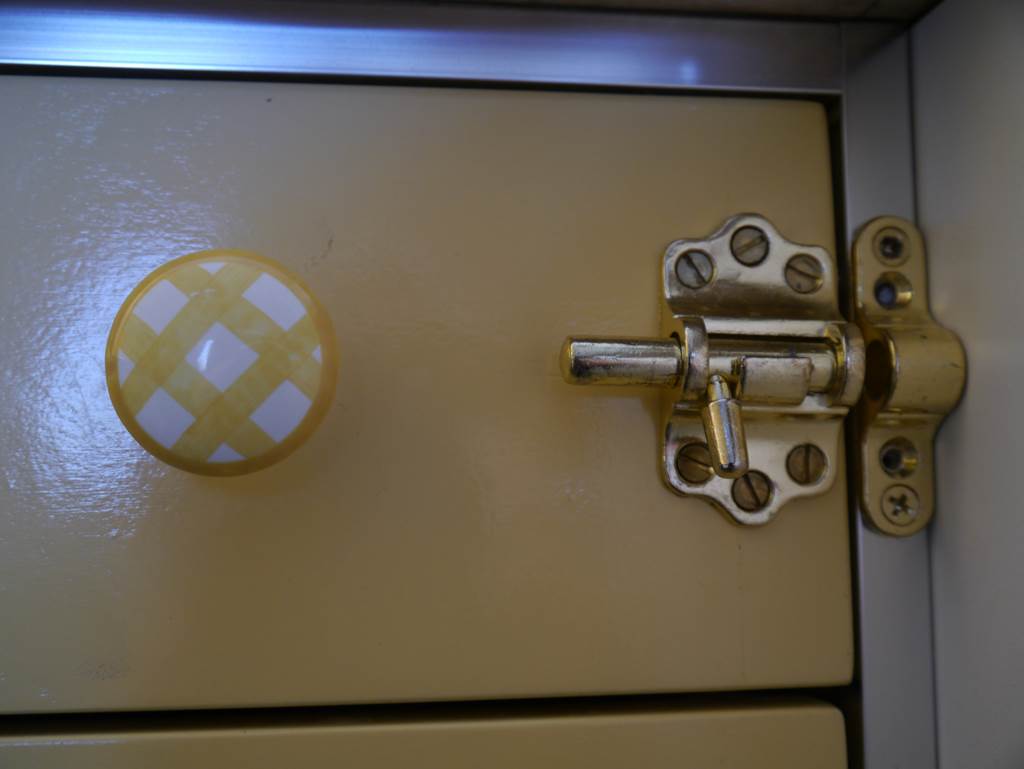 The original Boler came with either an ice box or a 1.7 cu/ft fridge. I wanted something larger and was able to find a good used Dometic RM2300 2.7 cu/ft fridge. This larger 3 way fridge fit perfectly between the raised floor around the perimeter of the kitchen and the counter top. The front panel of the fridge was painted in a checkerboard pattern which matches the ceramic handles