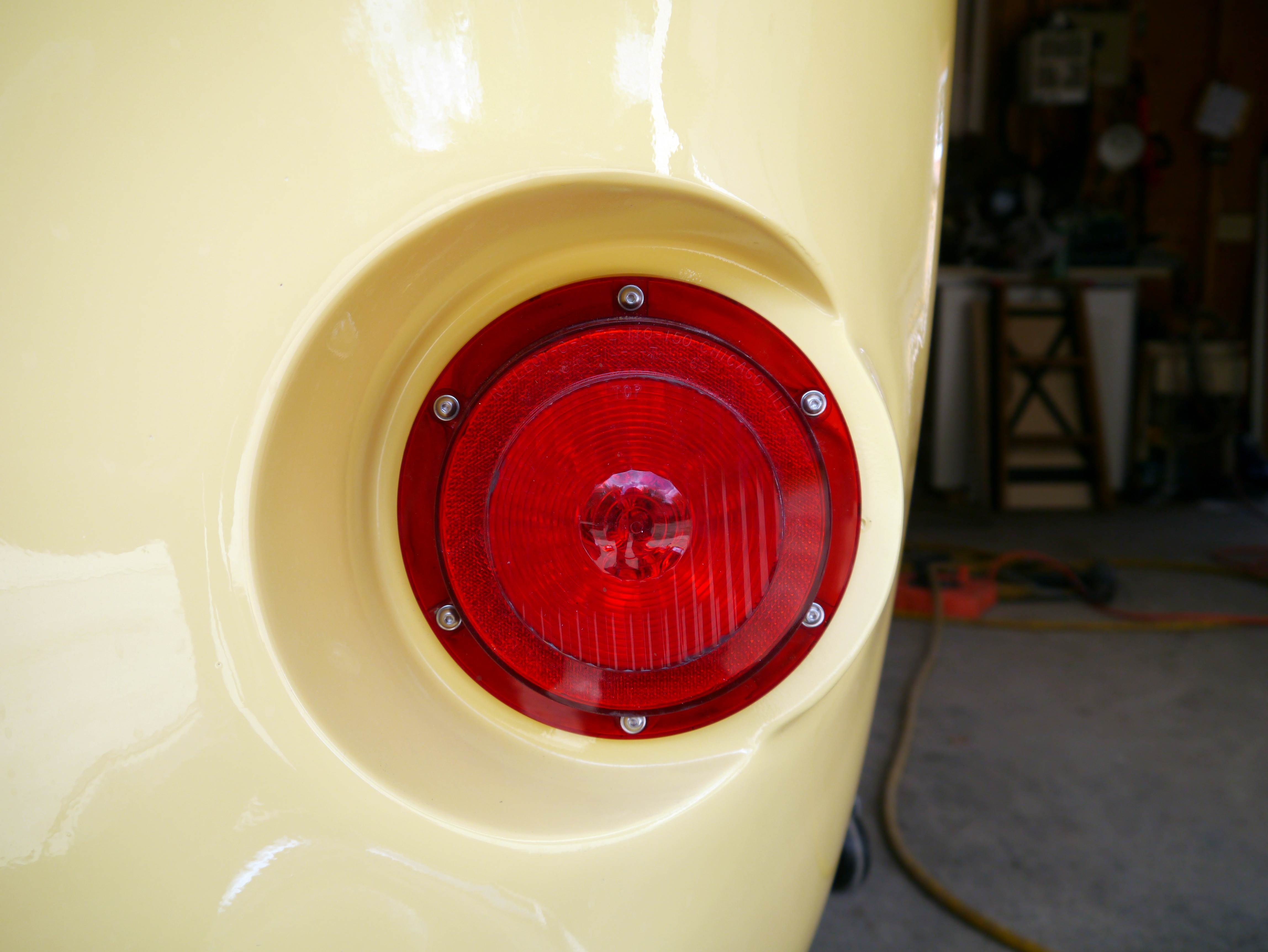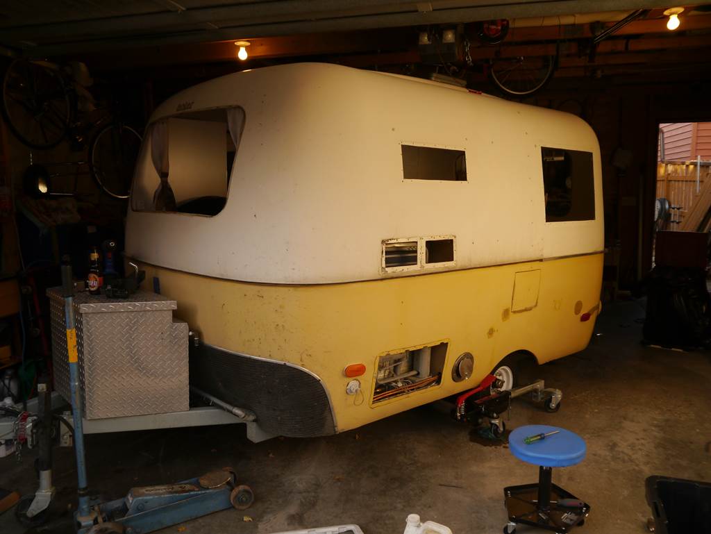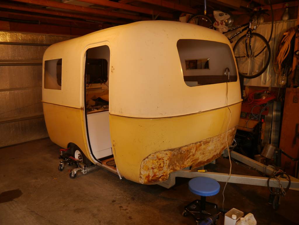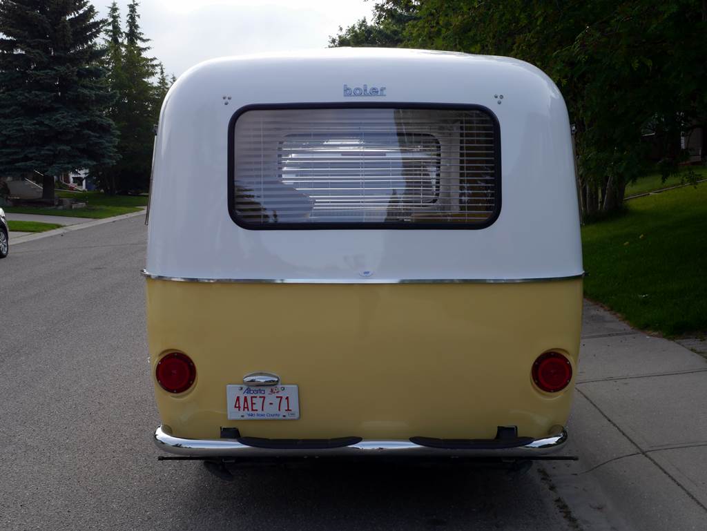 I wanted the smooth look of Frenched in the rear tail light housings rather than the riveted in tail light buckets, so I drilled out the original rivets and fiber glassed the housings into the body, With all the prep completed I was able, or wanted. to do I attached some temporary tail lights and off to a professional to complete the work. I found an experienced autobody man through a local classified ad,(Kijiji again) he had 30 years’ experience, factory trained by Mercedes, and was now working out of his home shop. He had refinished a Boler a few years earlier and was interested in working on my project.