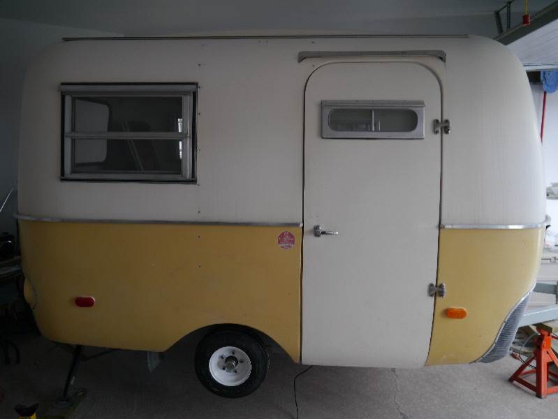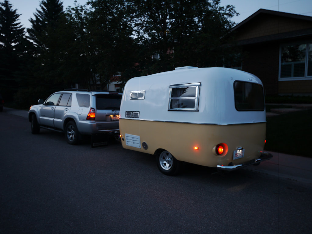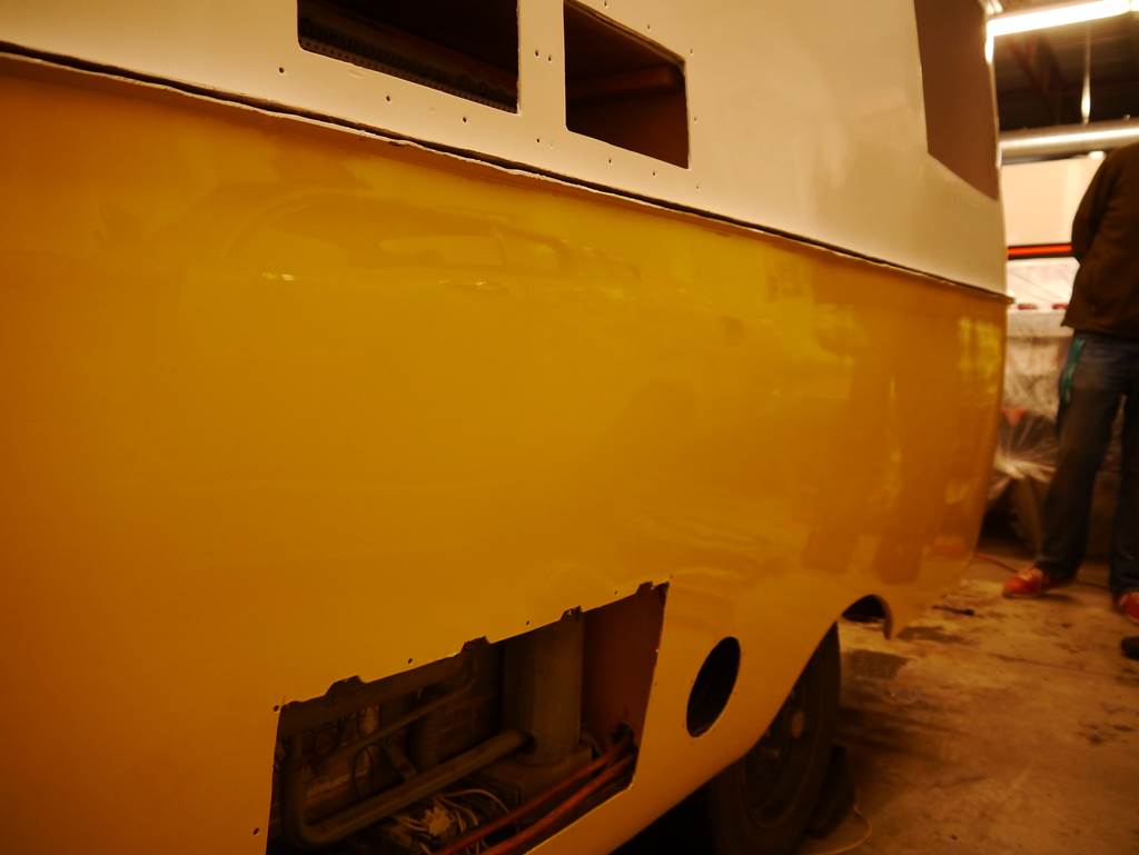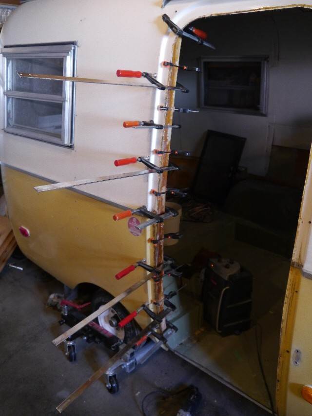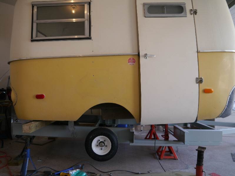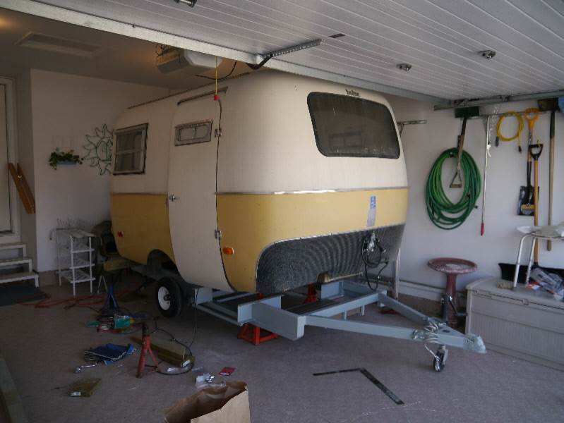 I wanted the smooth look of Frenched in the rear tail light housings rather than the riveted in tail light buckets, so I drilled out the original rivets and fiber glassed the housings into the body, With all the prep completed I was able, or wanted. to do I attached some temporary tail lights and off to a professional to complete the work. I found an experienced autobody man through a local classified ad,(Kijiji again) he had 30 years’ experience, factory trained by Mercedes, and was now working out of his home shop. He had refinished a Boler a few years earlier and was interested in working on my project.