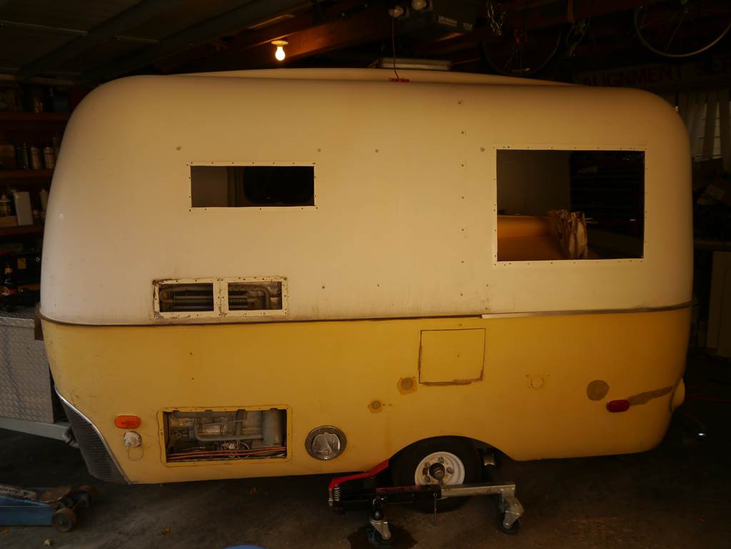 With the inside complete the next step was patching and refinishing the outside of the Boler. There were holes and patches where every rivet was, the furnace vent, water inlet and drains, as well as a damaged area in the rear corner where it was backed into something by a previous owner. The Boler looked pretty rough from the outside. With the Boler in the garage disassembly of the outside began, for a proper paint job everything on the outside needed to be removed including; the front and rear windows, both side dinette Jalousie windows, the small kitchen window, the fridge vents, belly band and the Boler emblems. With the Boler emblems removed I had officially eliminated every rivet through the fiberglass shell.