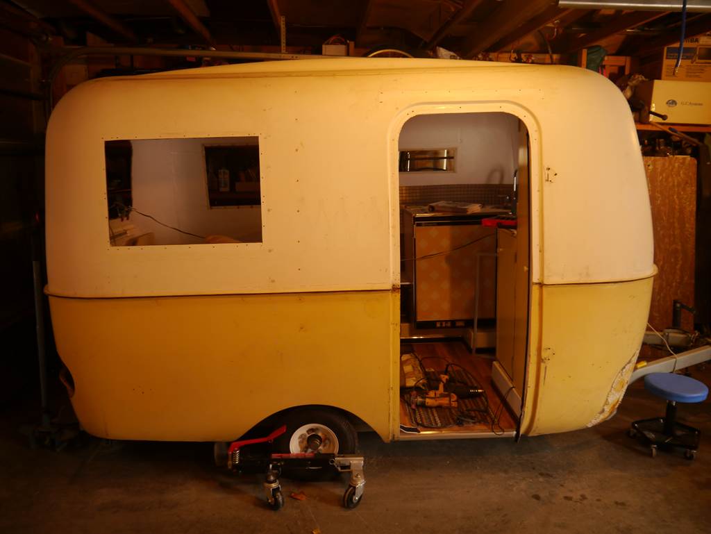 This is the story of how simply buying a 1974 Boler trailer has turned into an obsession, and like many renovation projects has grown far beyond the initial plan. Let me start with some background. We live in Calgary Alberta, our back yard is the Canadian Rocky Mountains which has some of the best scenery and camping in the world. As a family we have enjoyed camping trips throughout the summer months, sitting around the campfire, hiking the many trails and sleeping in a tent. As my wife and I get older the idea of packing and unpacking the car, setting up the tent, crawling around on the ground and the hardest part, getting up off the ground in the morning it was time to get something a little more comfortable. Like many I have always noticed the unique look of the Boler trailer and in January of 2011 I found a 1974 Boler 1300 in reasonable shape. The outside looked to be in fairly good for its age, there was a small area of damage near the left rear corner where it hit something while being backed in, just in front of that damage was a section that contoured in slightly and the gel coat was cracked but in my mind these were minor and easily fixed. The inside had dark burgundy curtains, plaid upholstery, a 110V dorm fridge in place of the ice box (this looked brand new), the original sink, faucet and stove, fiberglass table and new maple plywood doors. The floor was covered with brown outdoor carpet which was very worn and dirty