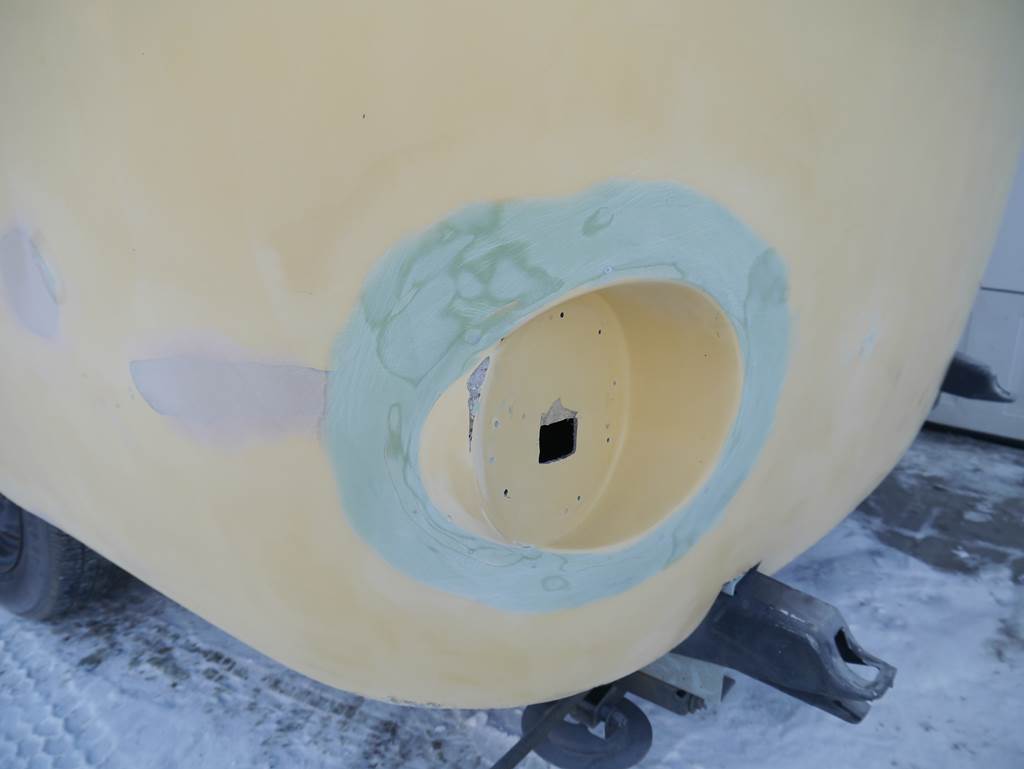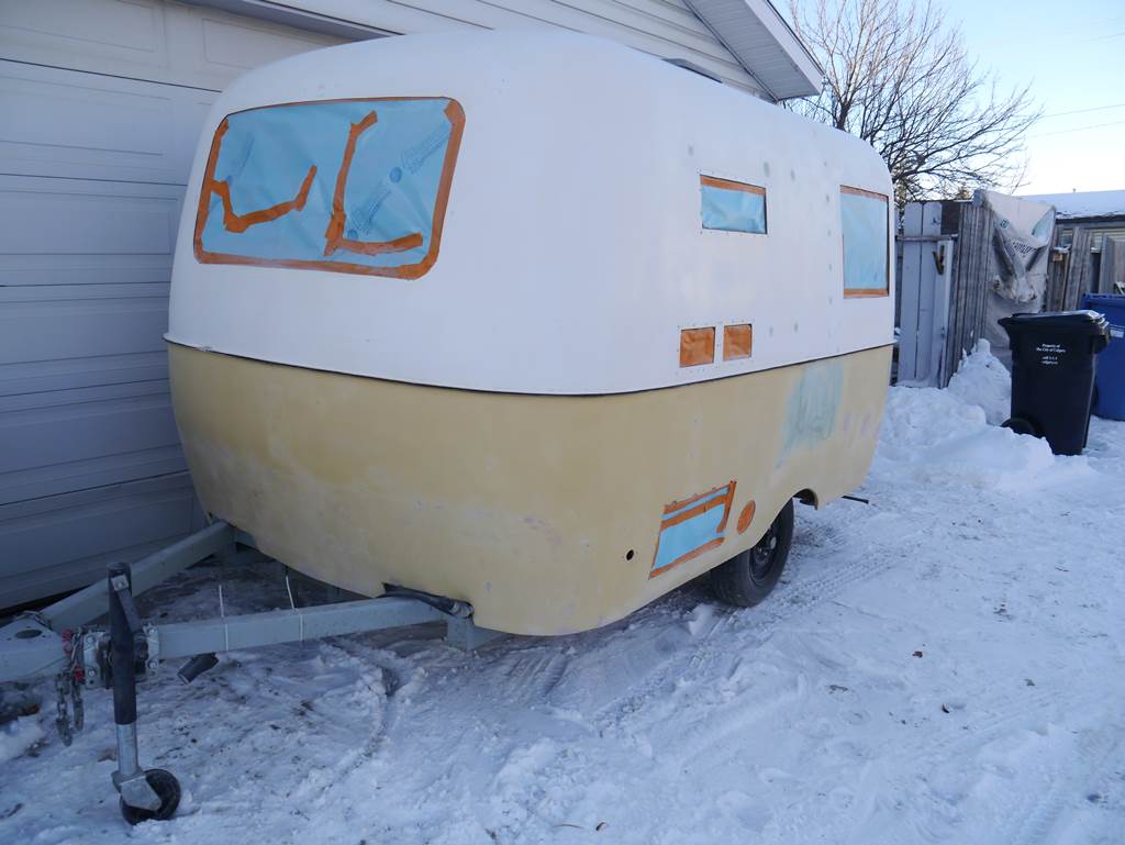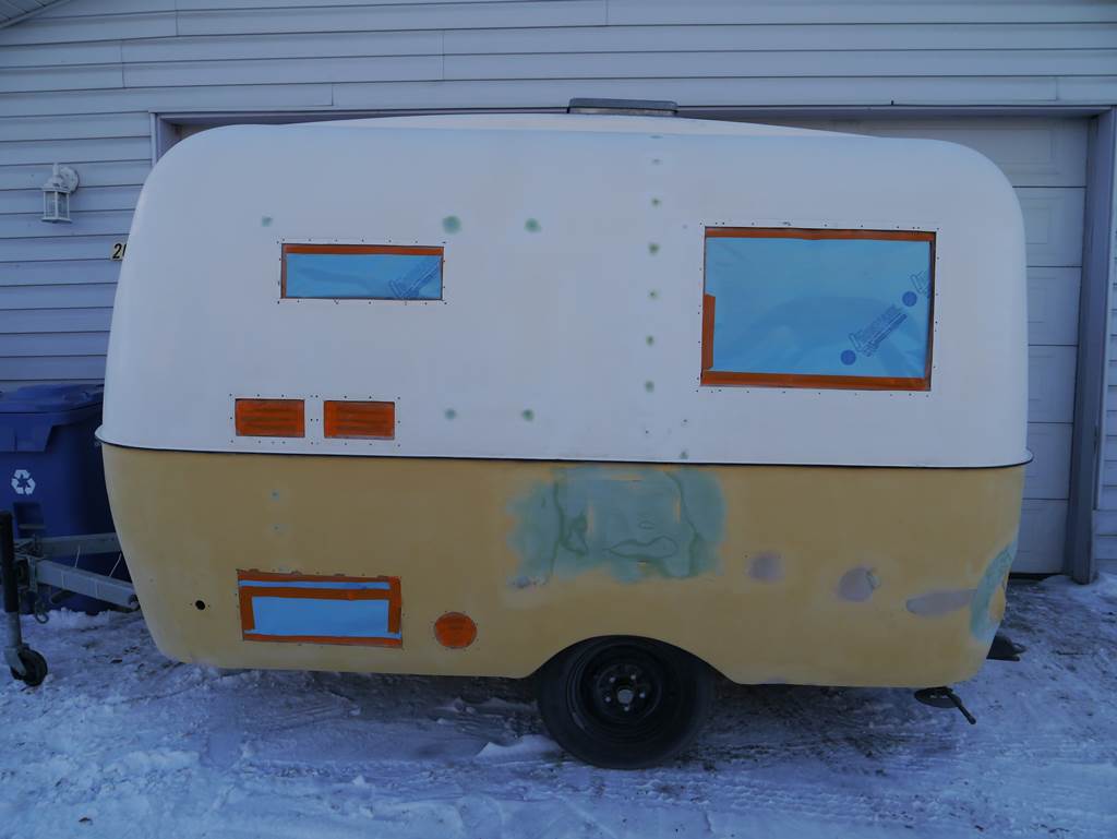 After a few weeks I was eager to inspect the work, to my surprise when I arrived the Boler was sitting outside his garage. I will start by answering the obvious question NO we are not doing the bodywork outside in the snow and frigid temperatures!!! We simply moved it outside to blow off the dust and clean the shop. First part of the bodywork is complete, any damage, holes, patches have been repaired, filled and board sanded.