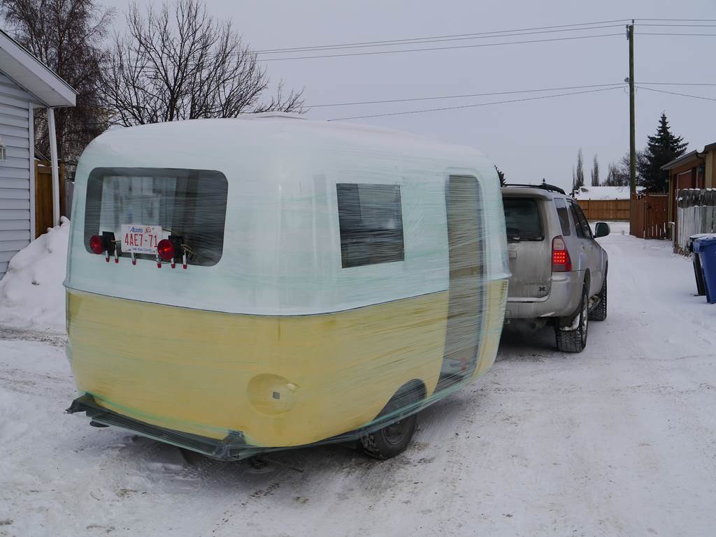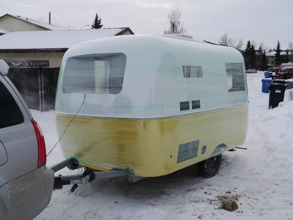 Not one rivet is left through the shell since all the cabinets and components are connected with brackets or anchors fiber glassed to the shell. The next step is for the primer to be applied along with a guide coat, it is then board sanded again and any minor imperfections are repaired. After priming any missed areas and imperfections are high lighted by board sanding the guide coat, then the final paint was applied. The paint we chose is an industrial coating designed for the marine and aviation industries. It is an extremely tough yet flexible two component highly cross-linked, high performance polyurethane coating made by Endura. We chose colors closely matched the original theme yet had a modern feel, using pure polar white for the top and matching the buttercup yellow from the interior (CLR28419 Tier 1 YELLOW (TM PPG 88283)). It is now just before Christmas, the weather is very cold and the streets are snow covered, how do I get the Boler home and protect the still fragile paint …. You wrap it like a Christmas present in pallet or plastic wrap.