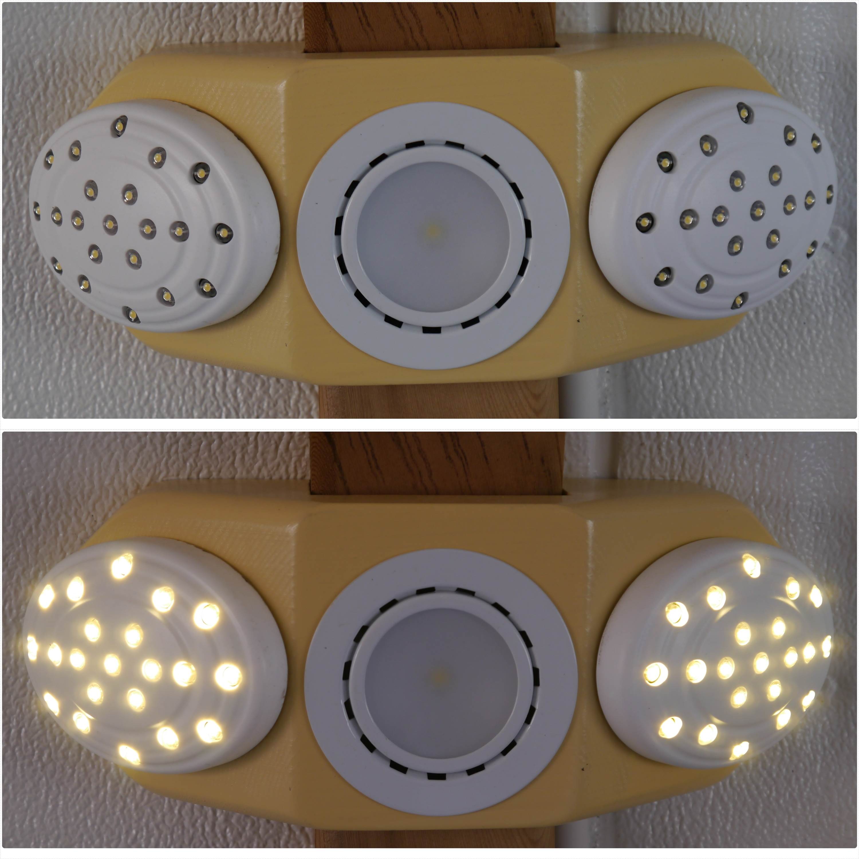 Positioned between the bright lights are 2 low intensity lights (one on each side) that provide enough light to get ready for bed or check the time at night.