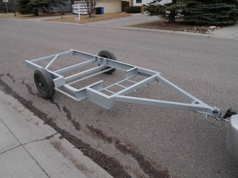 The final step is installing the fiberglass body shell back onto the frame. This was a relatively straight forward task, byy installing small 4.80×8” wheels on the axle it lowers the trailer enough to where it clears the garage door, making it easy to maneuver, just DON’T use these wheels for towing, they are not designed for the trailer weight or road speeds. As mentioned earlier the redesigned frame was the same length as the original but with the angle of the tongue changed to allow the side rails to be longer. This required some minor trimming of the fiberglass at the front so the body would slip down onto the frame rails. With the shell lowered onto the frame it is securely bolted down using 3/8” grade 5 bolts (5 bolts on each side) with deformed thread lock nuts, large fender washers are used on the inside to distribute the load over a larger area of the fiberglass.