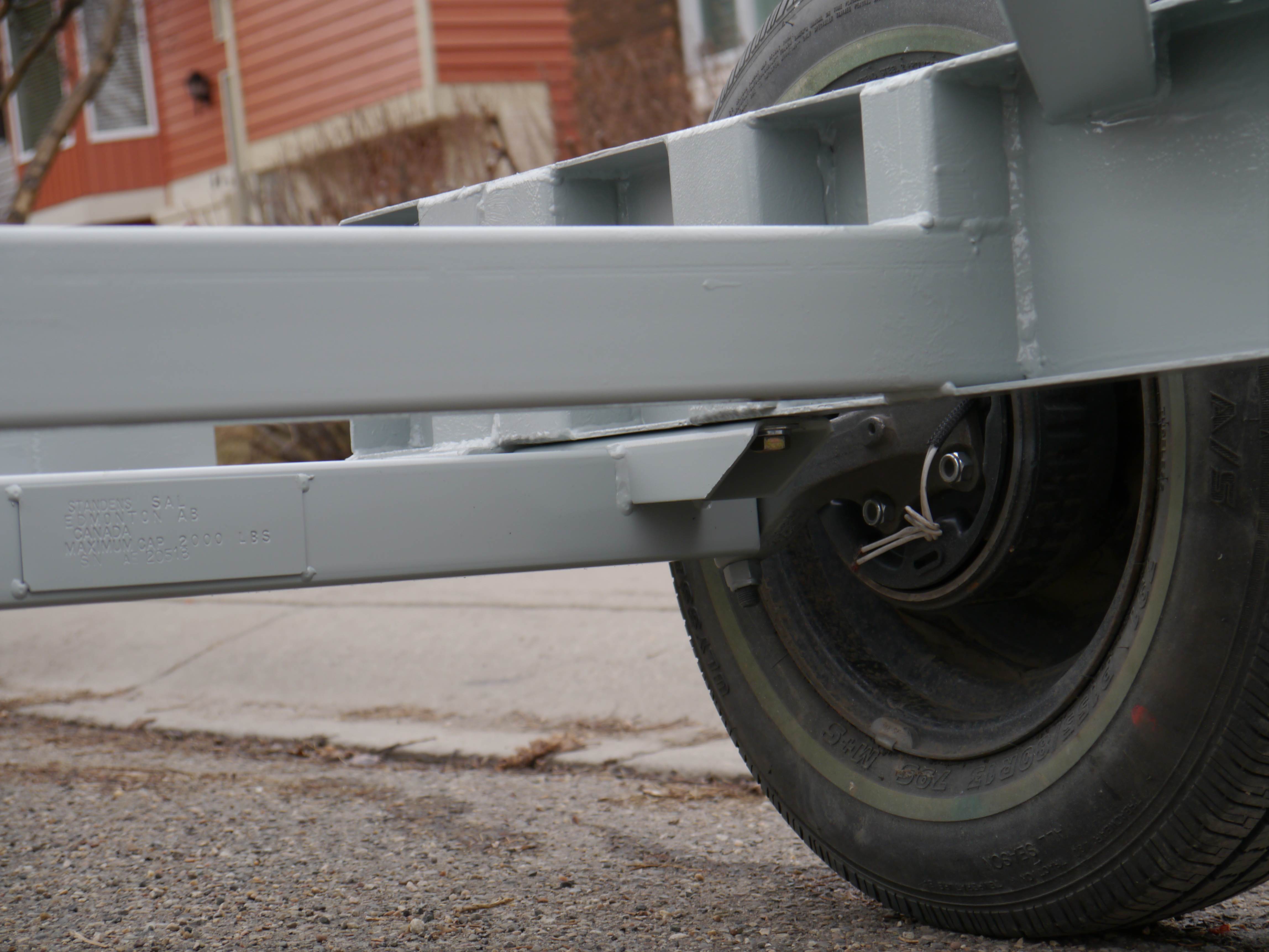 The axle I selected is a 2000 lb Flexiride rubber torsion axle which I had custom made at Standen’s in Calgary. The main reason I chose this axle is the ride height is adjustable. The suspension arm is splined onto the torsion bars, by simply removing a clamp bolt the arm can be repositioned and installed at any angle on the spline. The new axle also included 7″ electric brakes. One interesting fact is that the Boler body is offset on the frame by one inch towards the left side (drivers side). This offset is assumed to allow a little more room in the kitchen area, but the result is if the axle is centered on the frame the right wheel will be closer to the fender opening than the left wheel. If you ever need to replace your axle have the axle mounts offset so the axle is centered under the Boler body and not centered under the frame. I positioned the trailing arms at a 10 degree up angle which results in the Boler sitting just over 1″ higher than the original on the original, with just under 11″ of ground clearance to the bottom of the lowered kitchen floor, and 9″ clearance to the frame support under the door and the bottom of the axle tube.