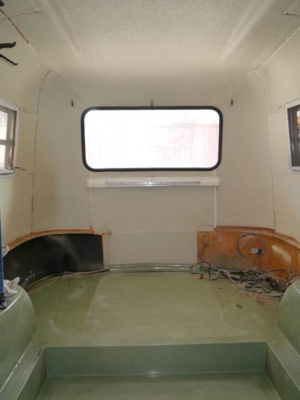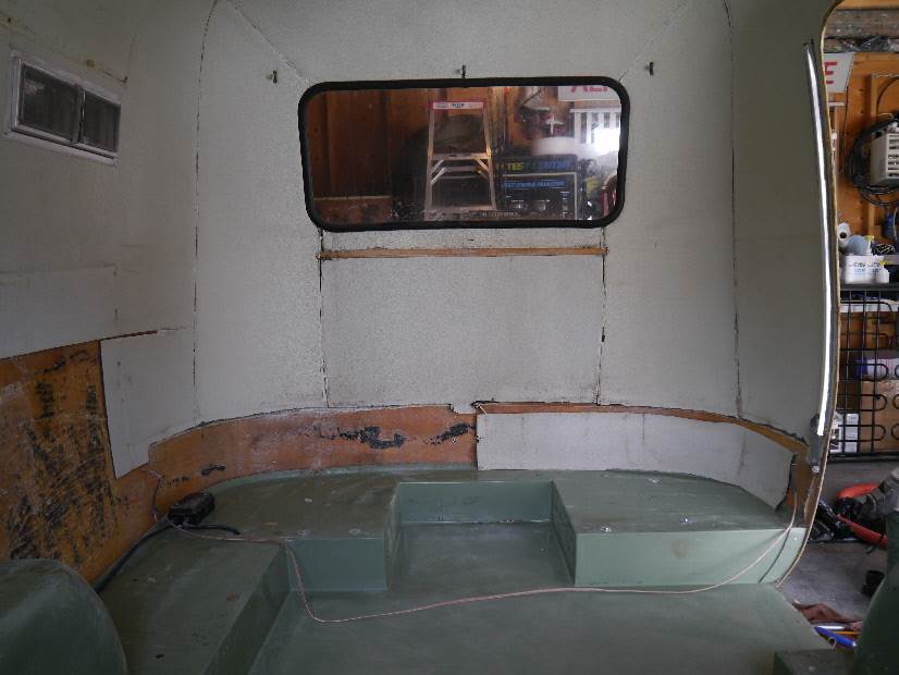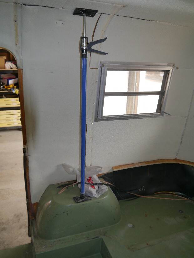 The first step in rebuilding the interior was to remove everything. All the original cabinets are held in with pop rivets through the walls and some screws into the floor. The only exception to this is the closet is fiberglassed to the body shell next to the door opening. If you notice in the accompanying pictures I used a pole jack to support the roof and walls while the interior was emplty to prevent the walls from sagging.