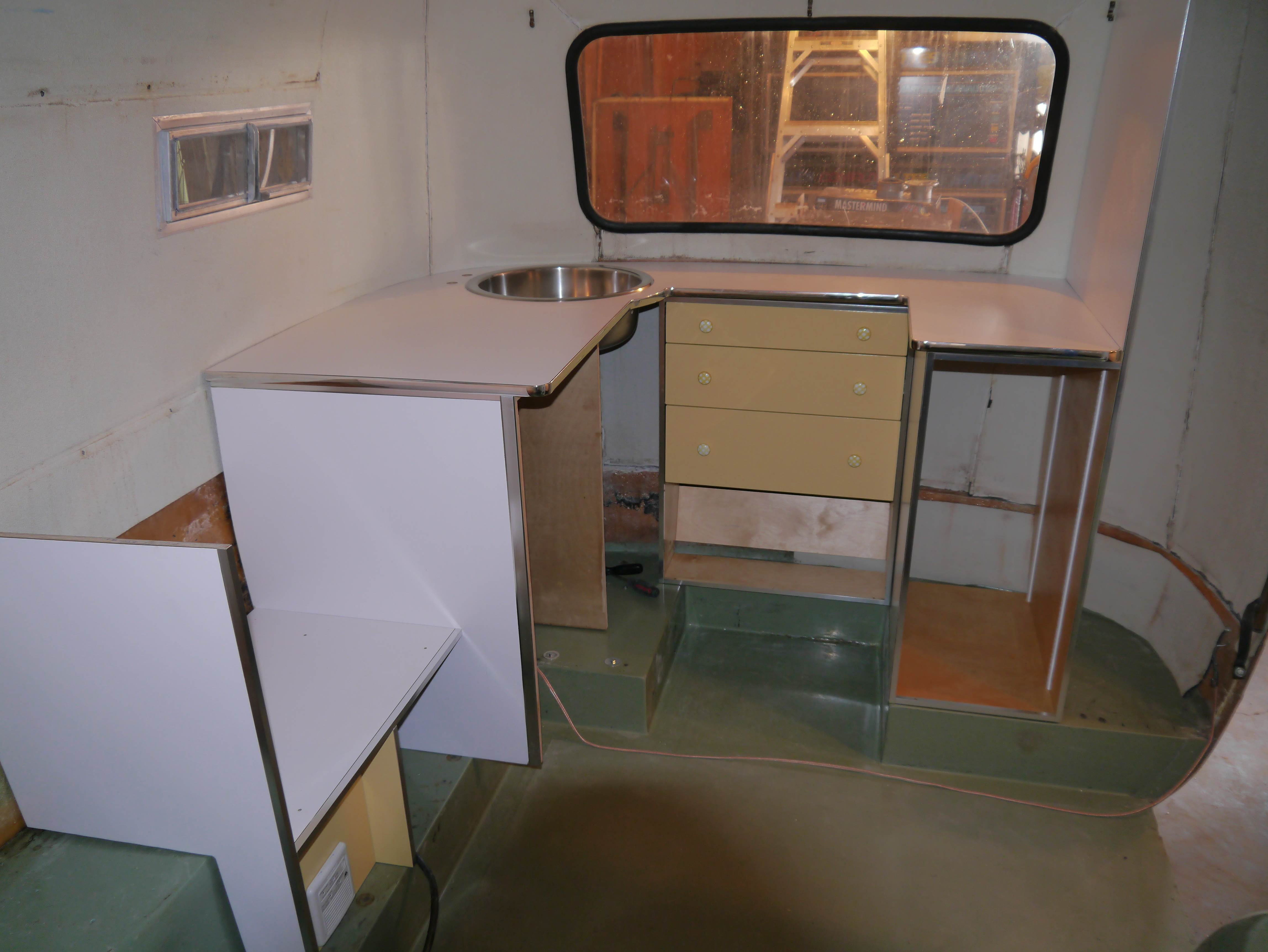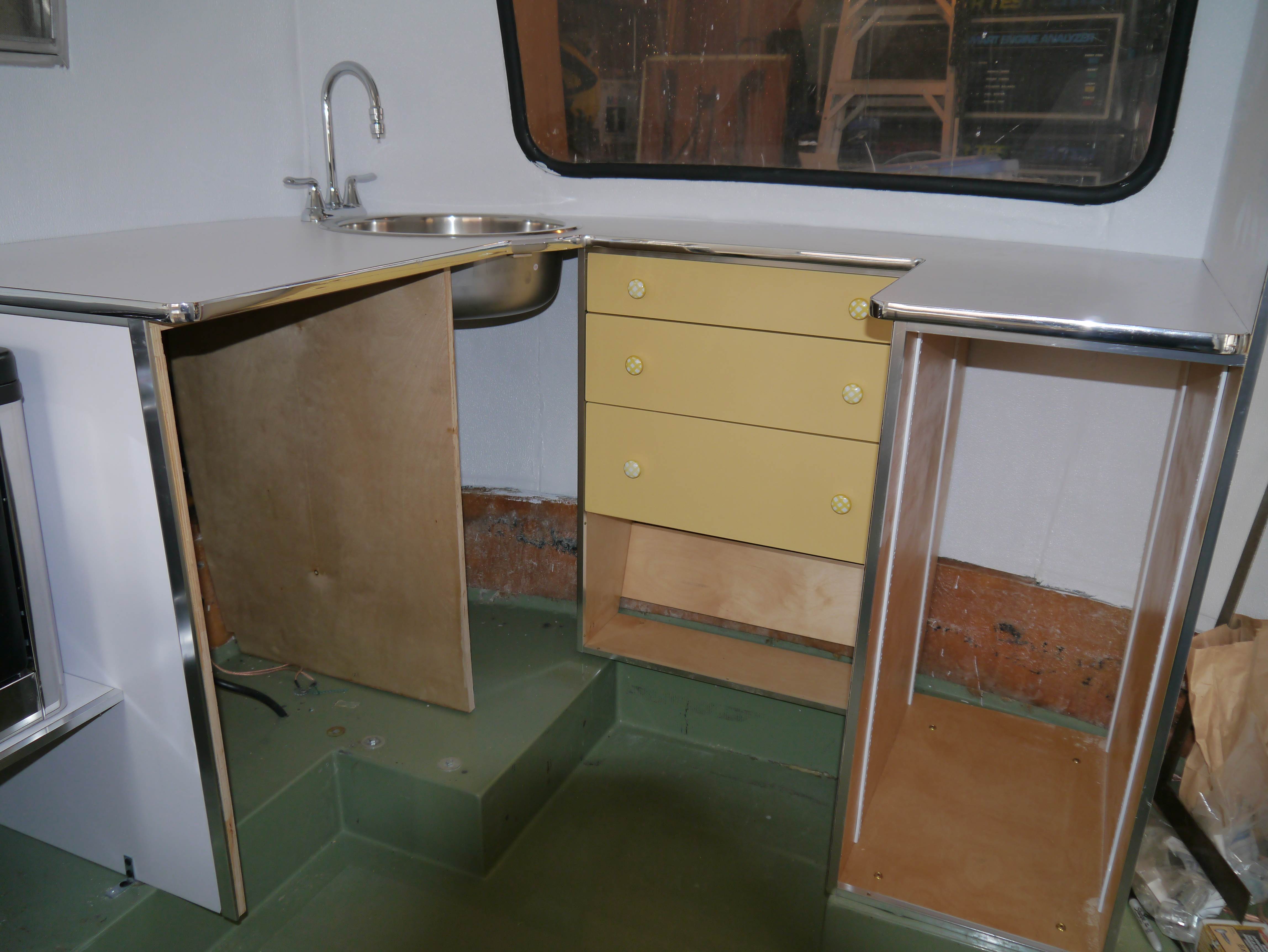 Cabinet making is one of my interests and hobbies; I have a very well equipped shop and have tackled a number of large and complex projects including building a complete custom kitchen in our house from cherry. Although I have many years experience I can honestly say building the cabinets in the Boler was the most complex and difficult project I have ever done. The outside walls of the Boler curve both vertically and horizontally, there is nothing straight for a reference. Each cabinet required numerous templates make from cardboard and/or foam core, each section is test fit, adjustments are made to make sure they fit correctly. The cabinets are all made from Baltic birch plywood, this is an extremely strong and stable wood but the cost often limits its use. I used thicknesses varying from 1/4” to 5/8” depending on the function and load but always keeping overall weight in mind, the majority are made from 3/8” and 1/2” thickness. The sides and the tops of all the cabinets are covered with satin white plastic laminate (Arborite) since it is very durable, easy to clean and heat resistant. The main kitchen area consists of five interconnected cabinets: the oven cabinet which goes over the wheel well and has a small cupboard underneath; the fridge cabinet; a 4 drawer front cabinet; a larger counter height cabinet with adjustable shelves that backs onto the front closet; and finally the front closet with shelves. An individual cabinet is placed beside the door which is an ideal bed-side table and conveniently holds the folding PETT toilet