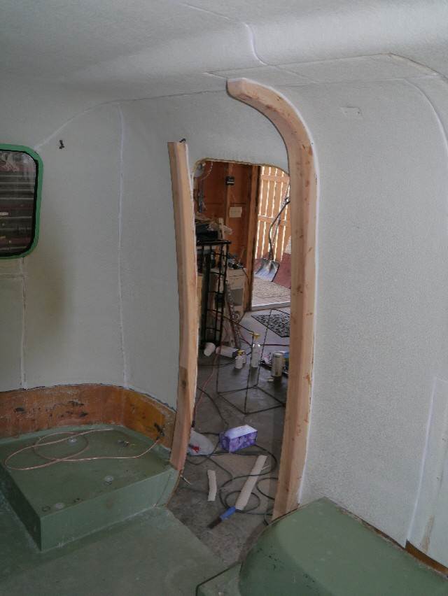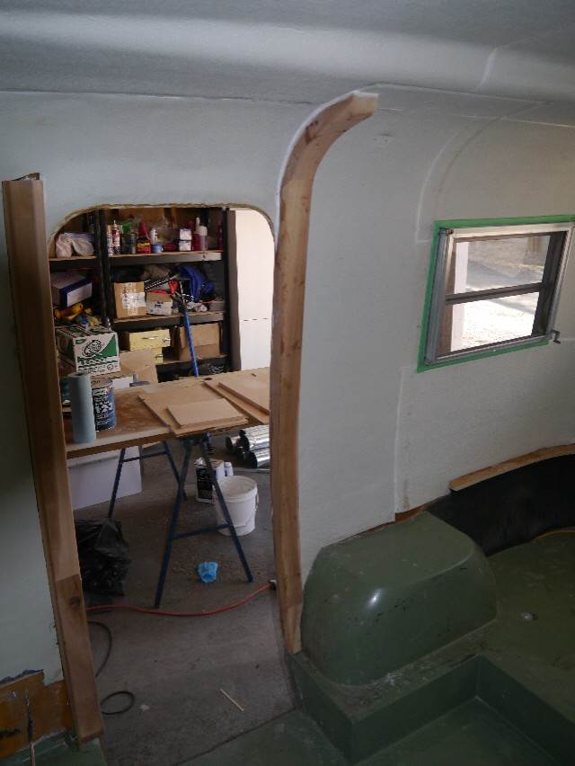 With all the interior cabinets removed there was nothing left to support the shell. With no support the walls will sag and in extreme cases the roof will collapse. Prior to removing the cabinets I made detailed drawings, templates and measurements of the wall profiles. These profiles were transferred onto four (4) curved support posts built from laminated western red cedar, this wood was chosen for its high strength to weight ratio and its resistance to rot. The locations for these supports would be one in the middle of each side wall just ahead of the side window frame, and two additional supports are added one on each side of the door opening.