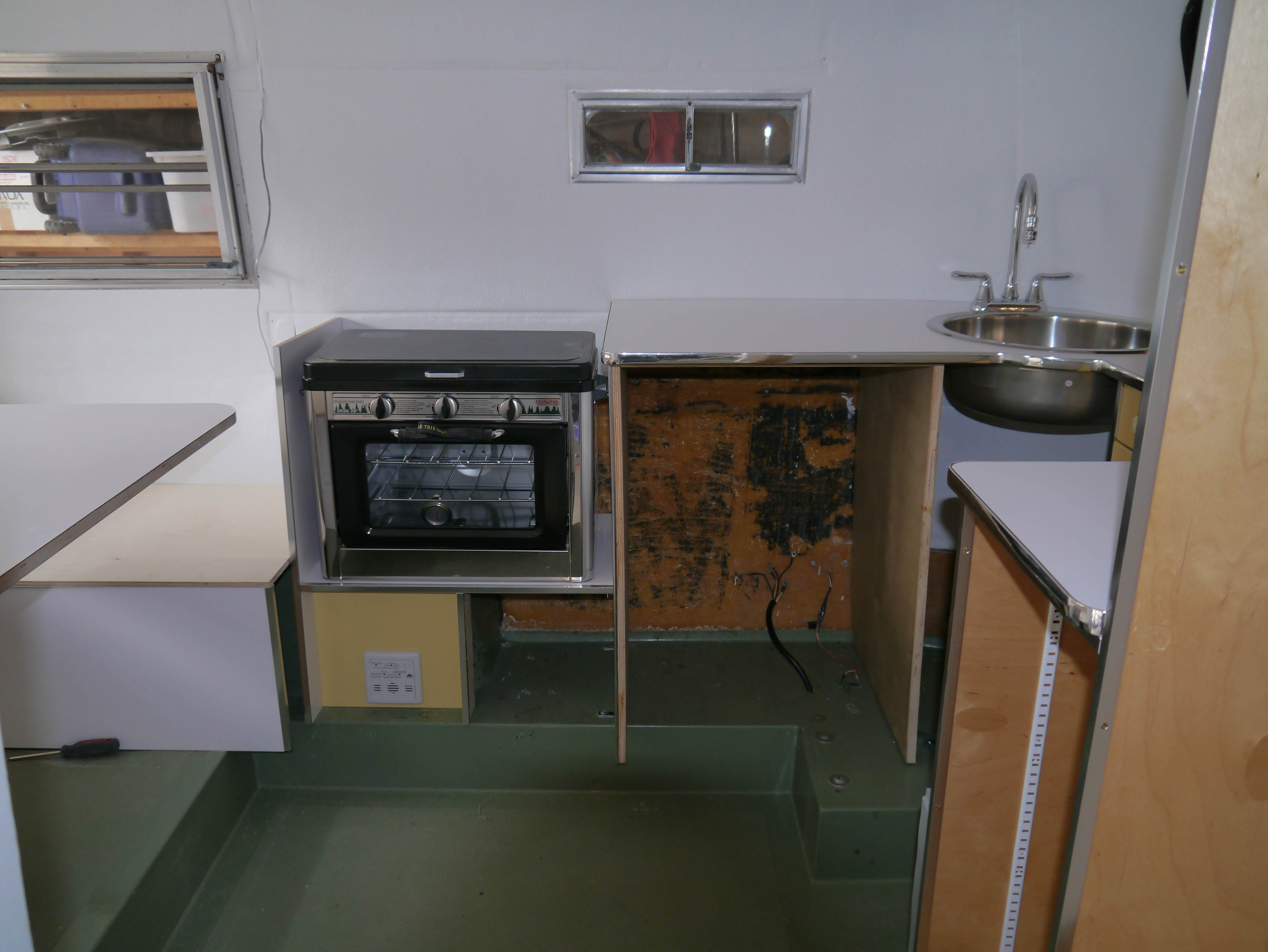 Every trailer needs a stove or cooktop but most models available are not the best quality nor are easy to control the burner flame. We have all tried to select simmer which is just on the edge of the gas being on or off, as you try to get the flame just that little bit lower “poof” it is out ..relight … try again. About a year before we bought the Boler I had purchased a Camp Chef stove/oven combo and was really impressed with both the quality and burner control, plus it had the small built-in oven (which was more of a novelty but still fun and functional). Looking at the stove there are warning stickers all over it stating “for outdoor use only” DO NOT use indoors”, etc., but let’s face it, an open flame should NEVER be used in a closed space, always have a window or ventilation open and keep an eye on it, this goes for any stove installed in a trailer. My biggest concern with installing the stove was how hot the outside would get with the oven on. I performed extensive temperature testing on the stove with the oven running at maximum temperatures for extended periods of time and calculated safe clearances on all sides. The stove is mounted to 1″x1″ square aluminum tube which in turn is mounted to the cabinet and the copper propane supply line is connected directly to the propane inlet line for the stove, After installation I rechecked the temperatures with the oven running and my calculations were confirmed the surrounding cabinet surfaces remain well below any dangerous temperatures.