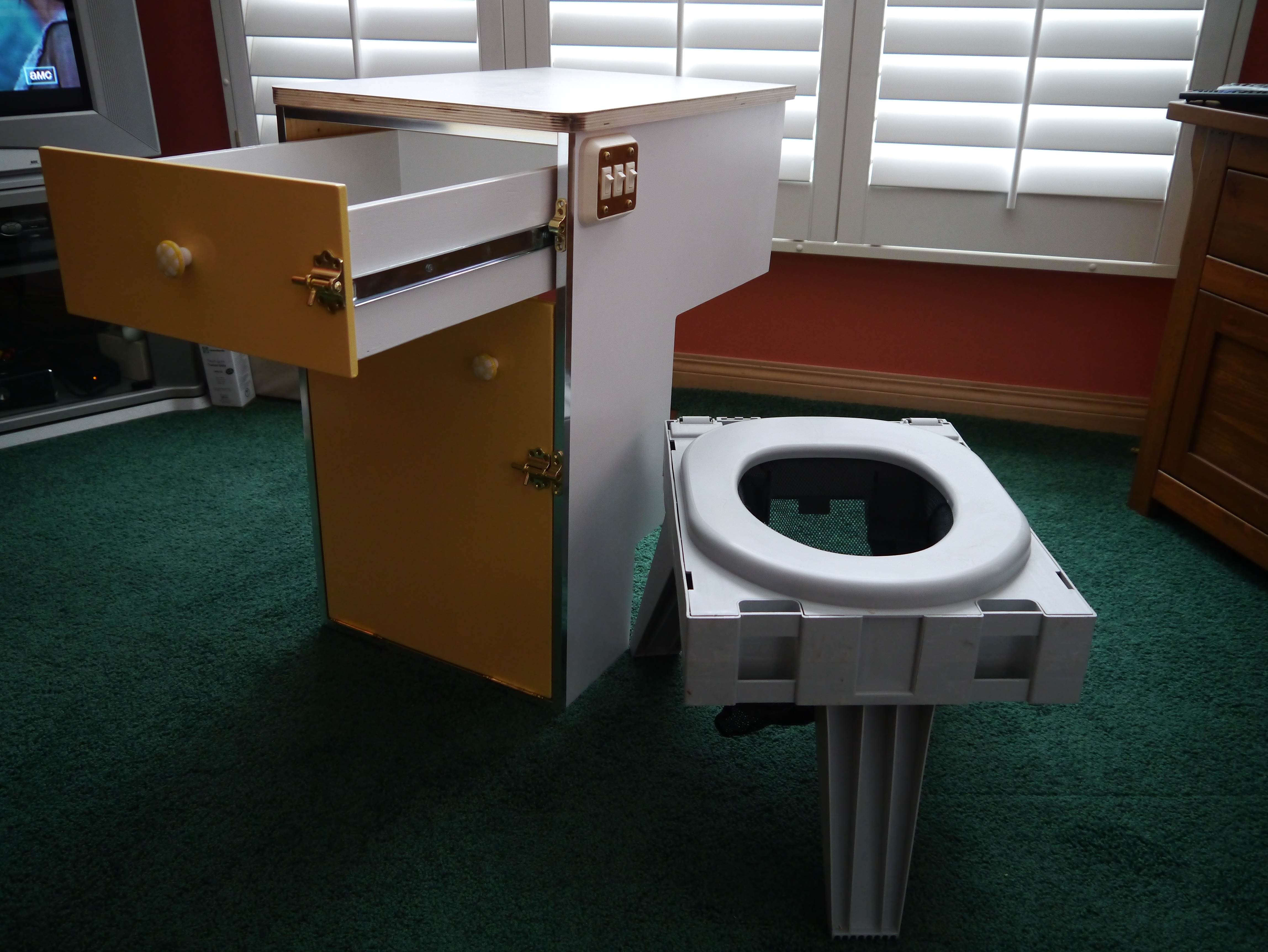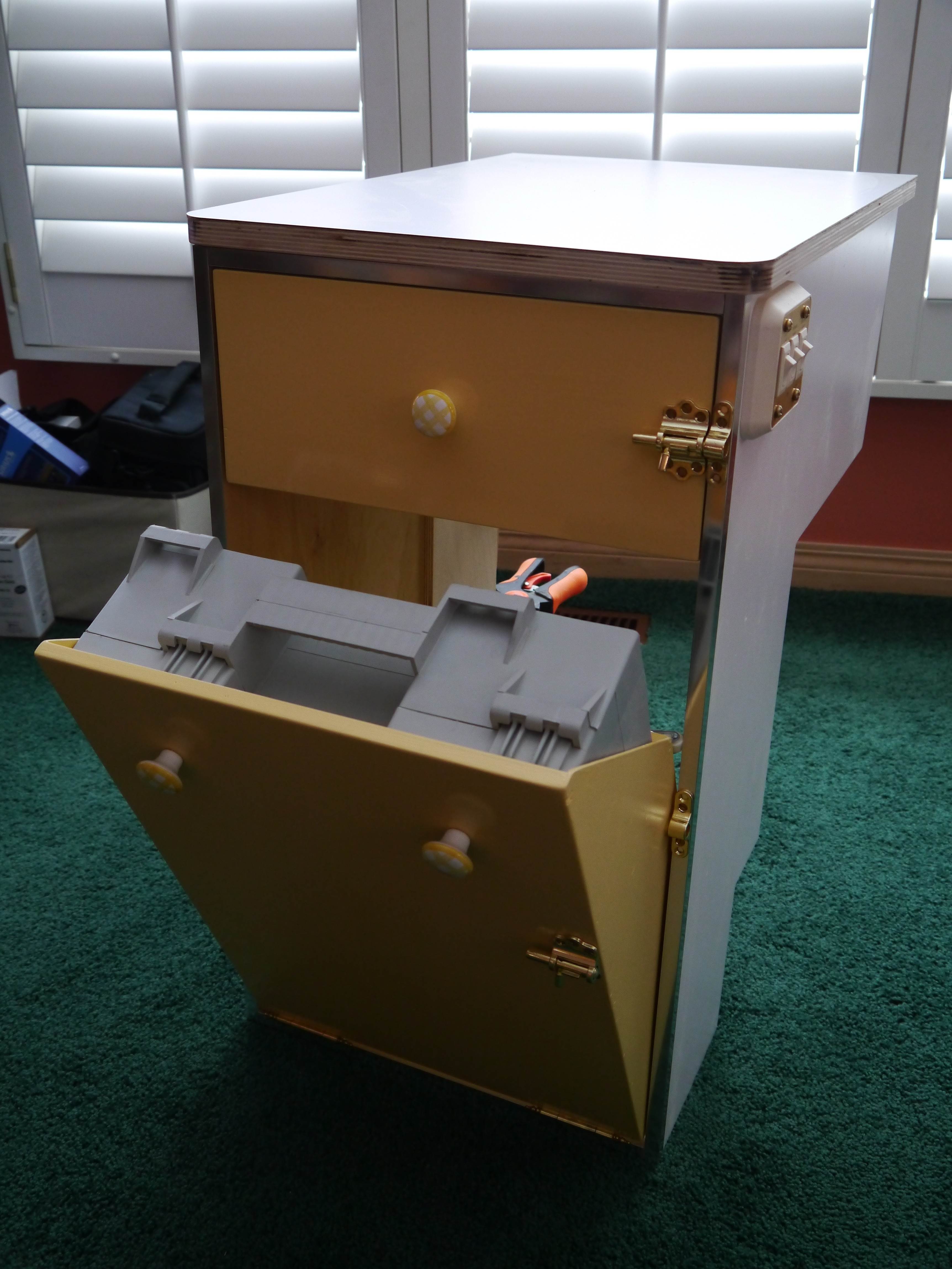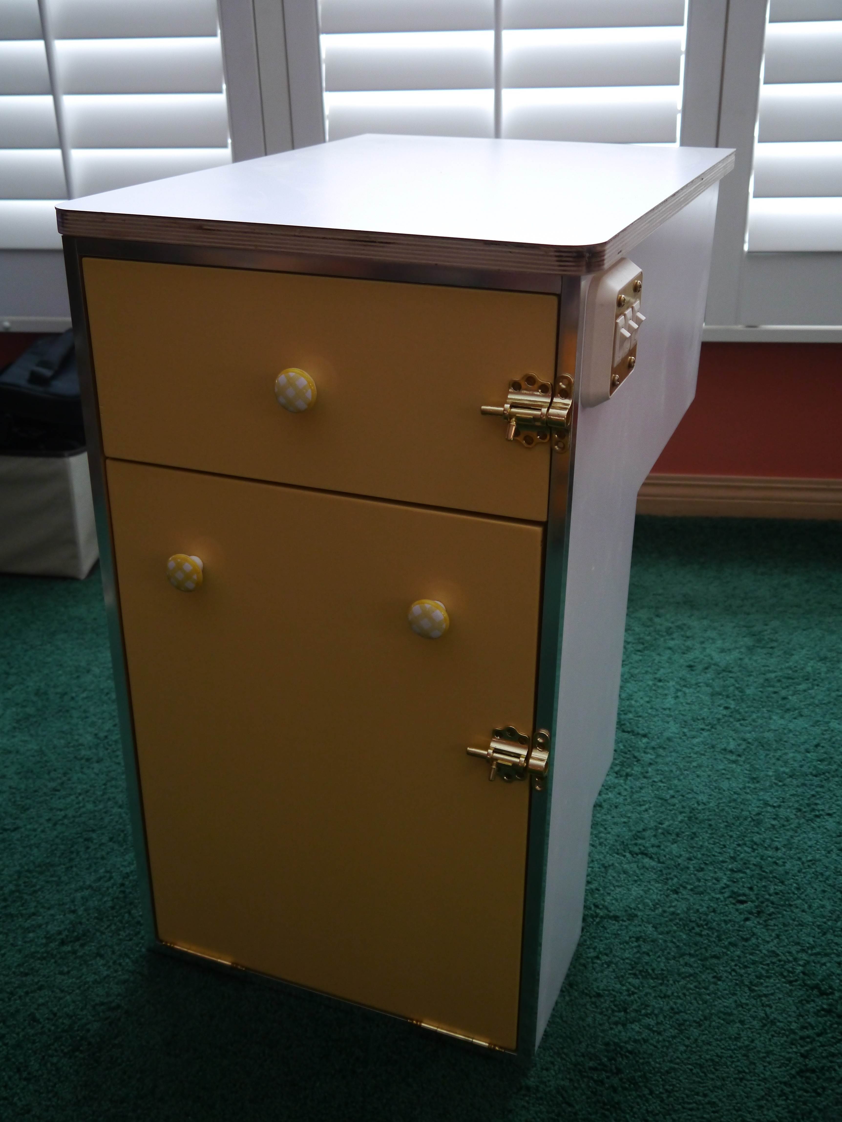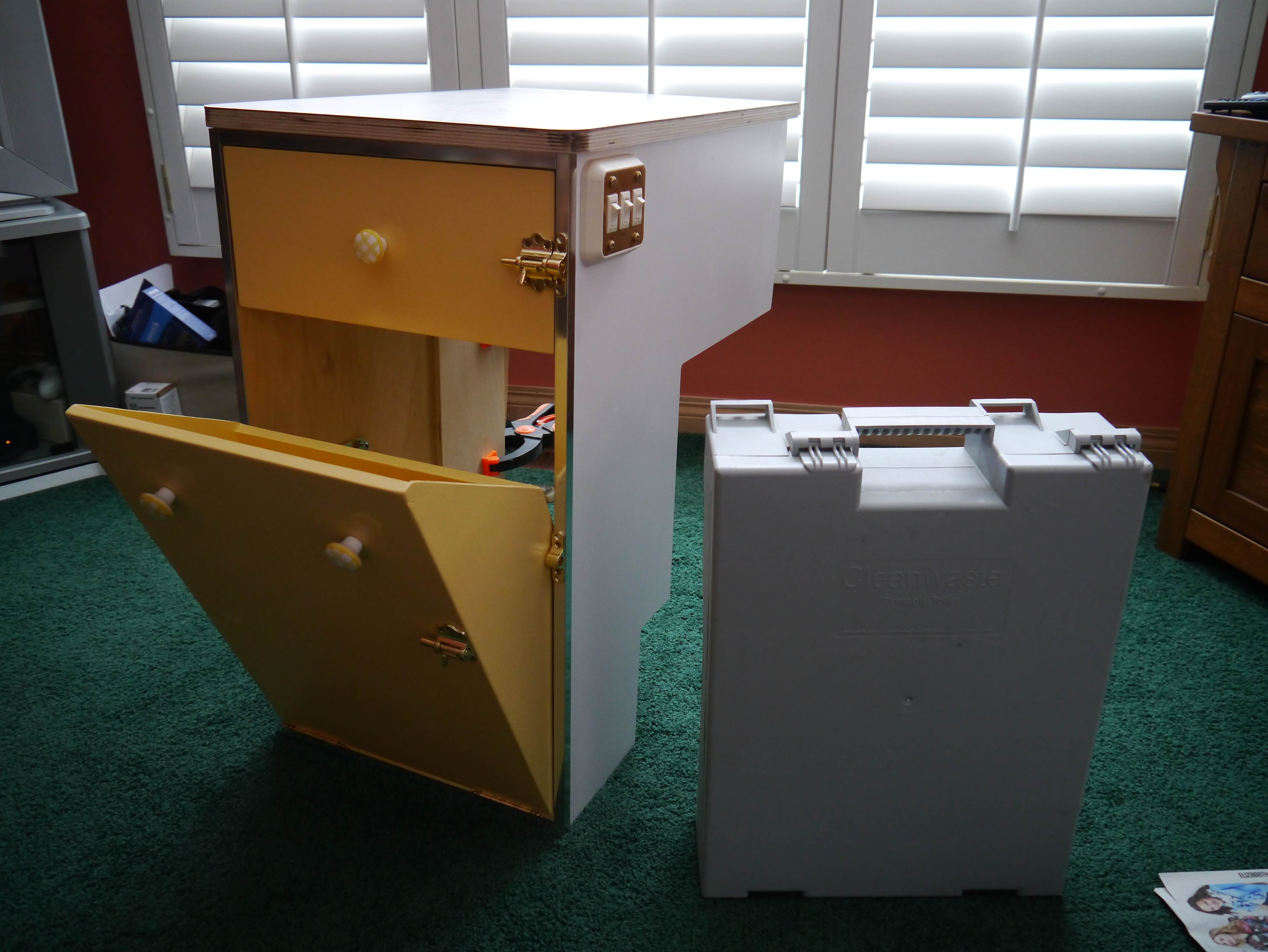 In place of the original closet beside the bed/kitchen was an ideal location for a small cabinet that would conceal our folding porta-potty. The switches on the side of the cabinet will control reading lights above the bed/table.