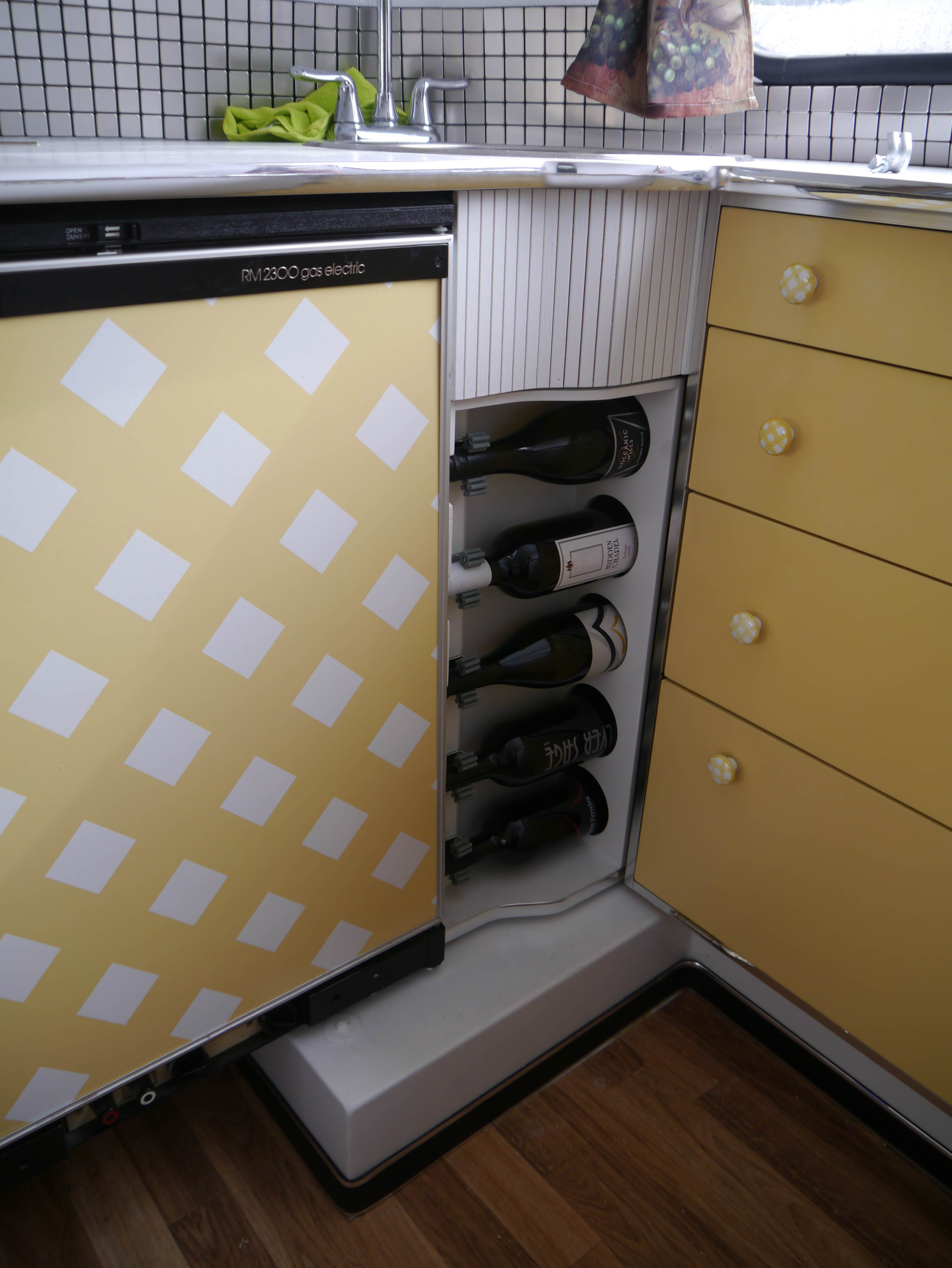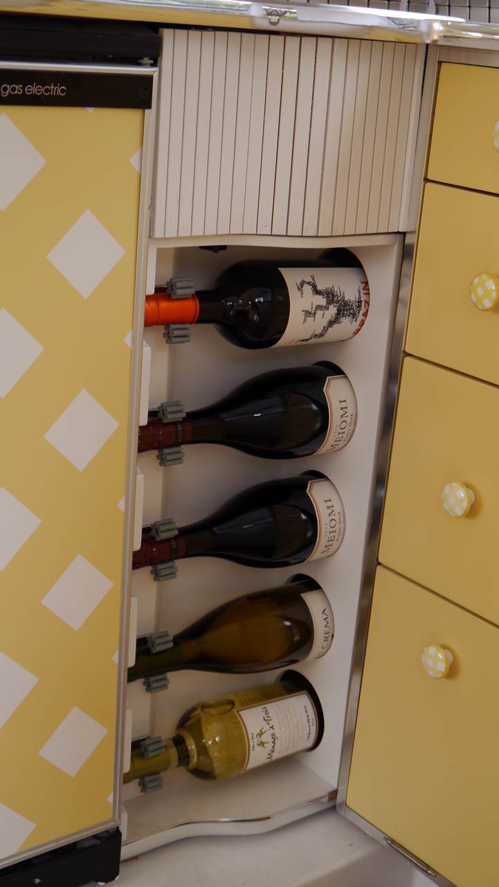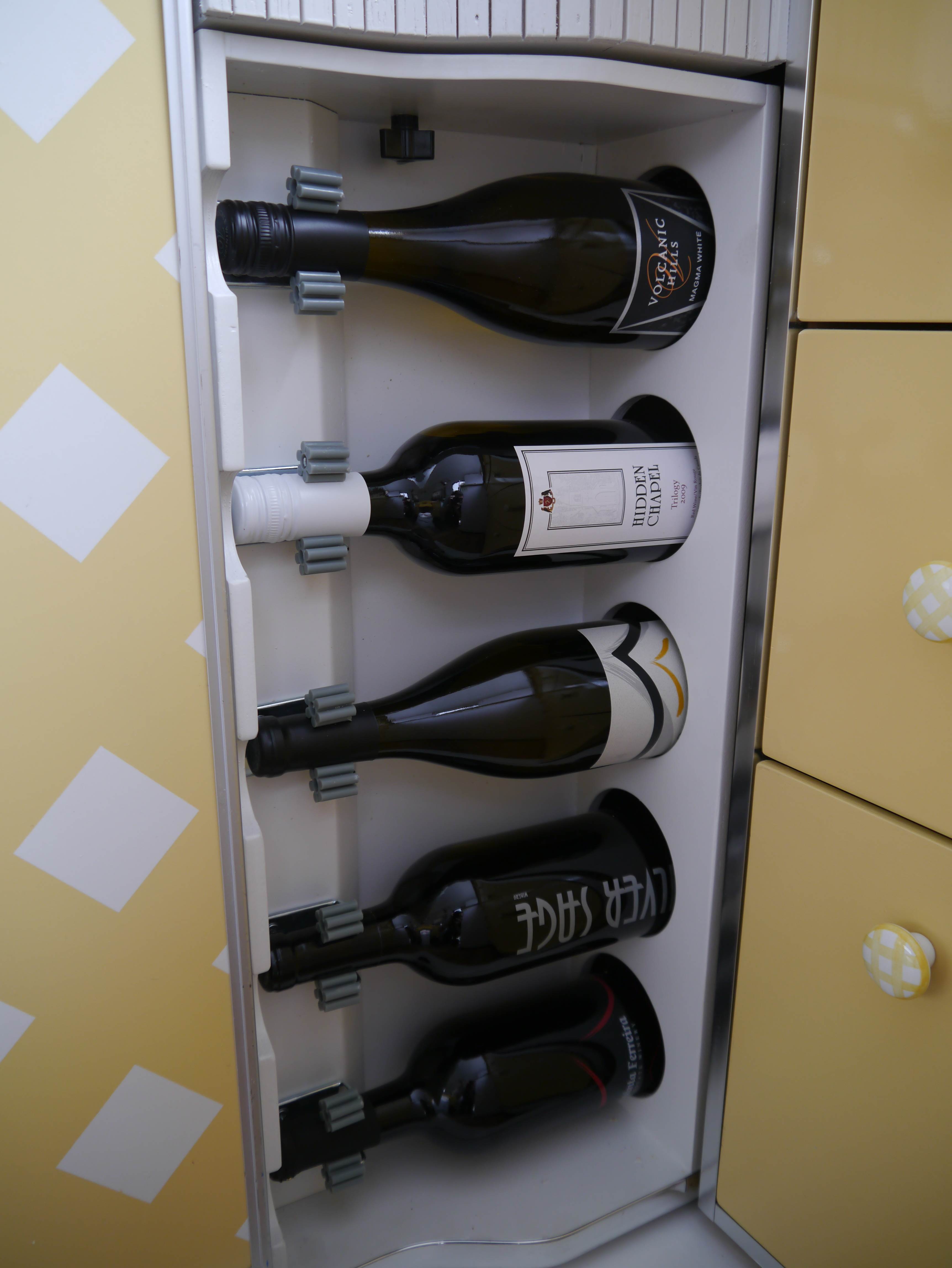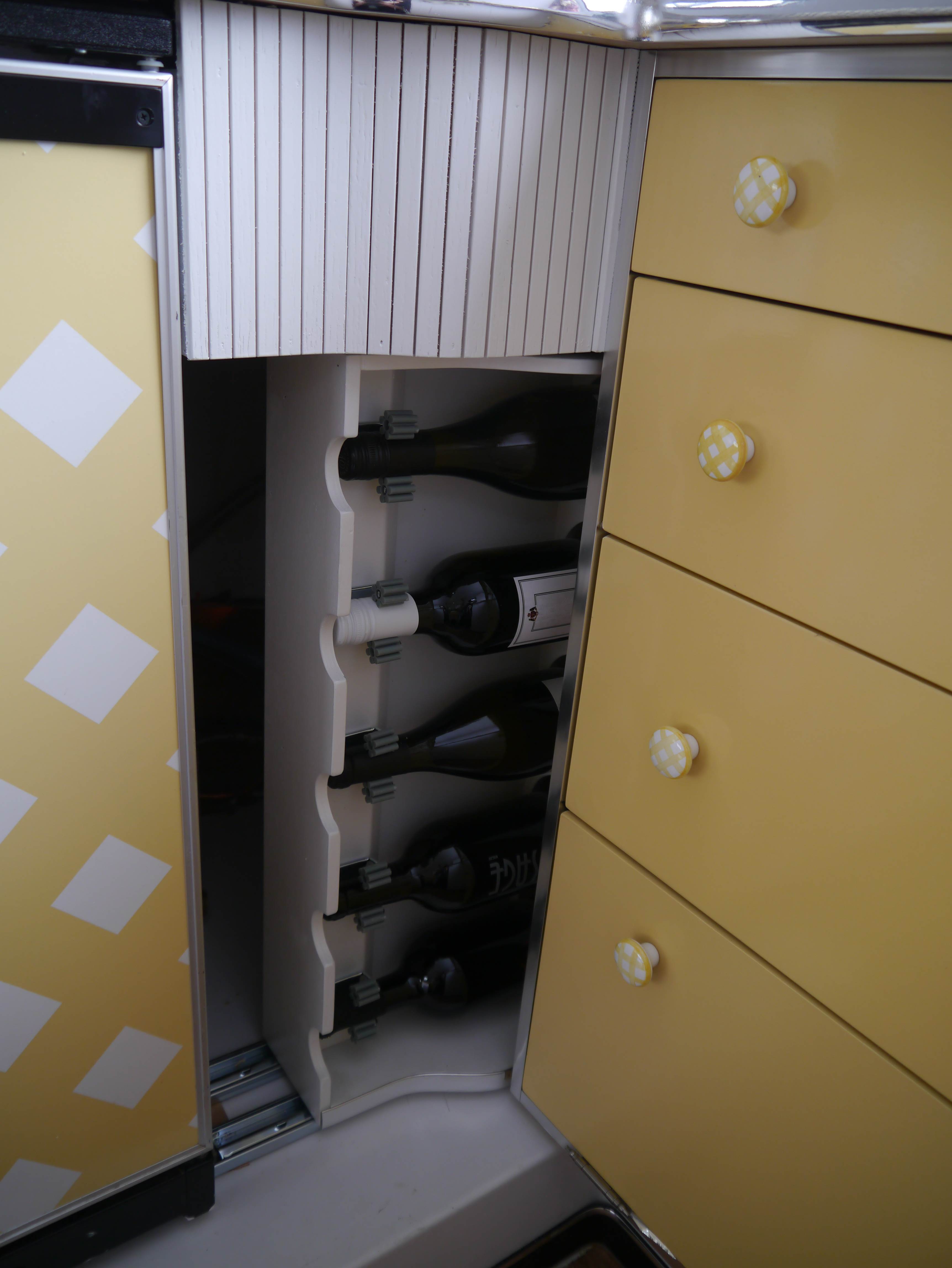 The interior cabinets are complete except for the odd shaped opening under the sink. after some creative thinking influenced by our love of wine I decided the Boler needed a wine rack, The finished rack securely holds 5 bottles of wine and slides sideways to access the utility area under the sink which contains the water pump and hot water tank.