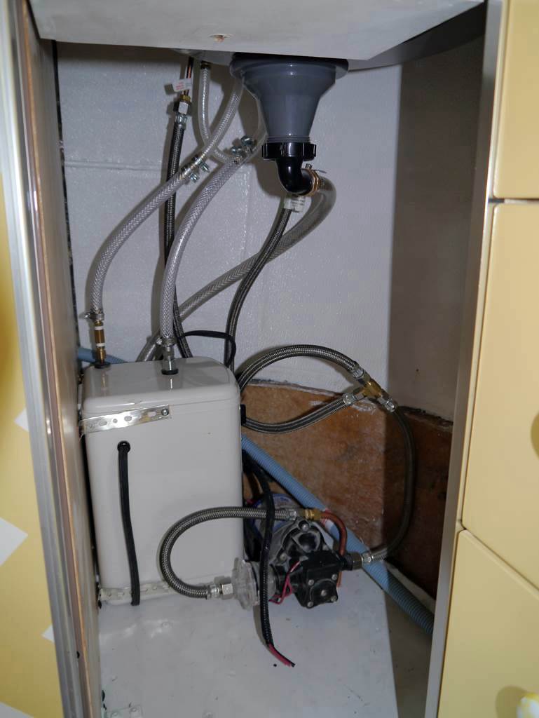 To replicate this design and ensure the tank would not be pressurized when the pump is running, or street water connected, I used a “wide mount faucet”. This type of faucet has the spout and valves separate, they are connected under the counter with flexible hoses rather than the one piece brass construction usually found in most faucets.