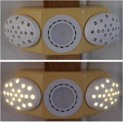 In between the bright lights are 2 low intensity lights (one on each side) that provide enough light to get ready for bed or check the time at night.