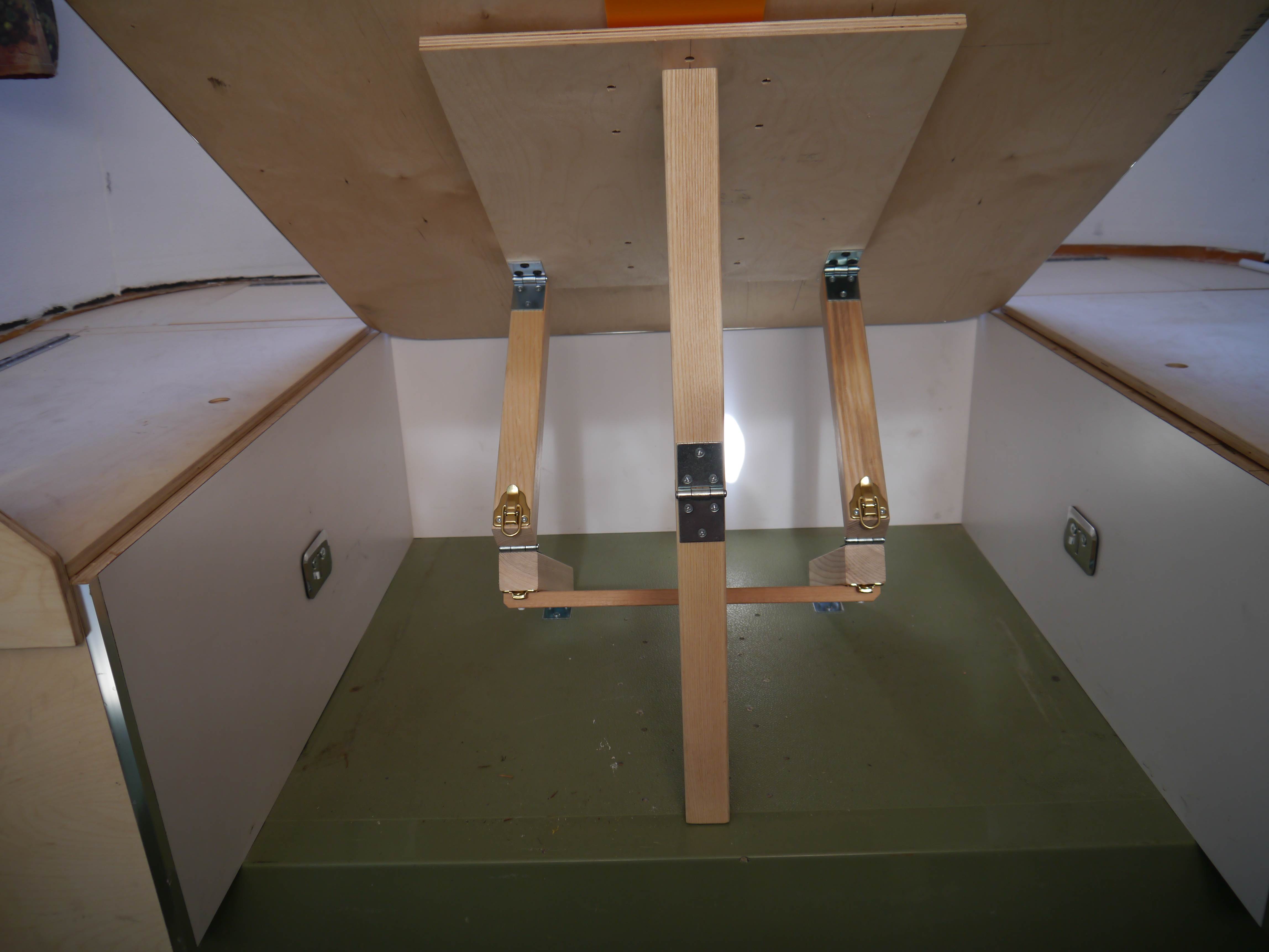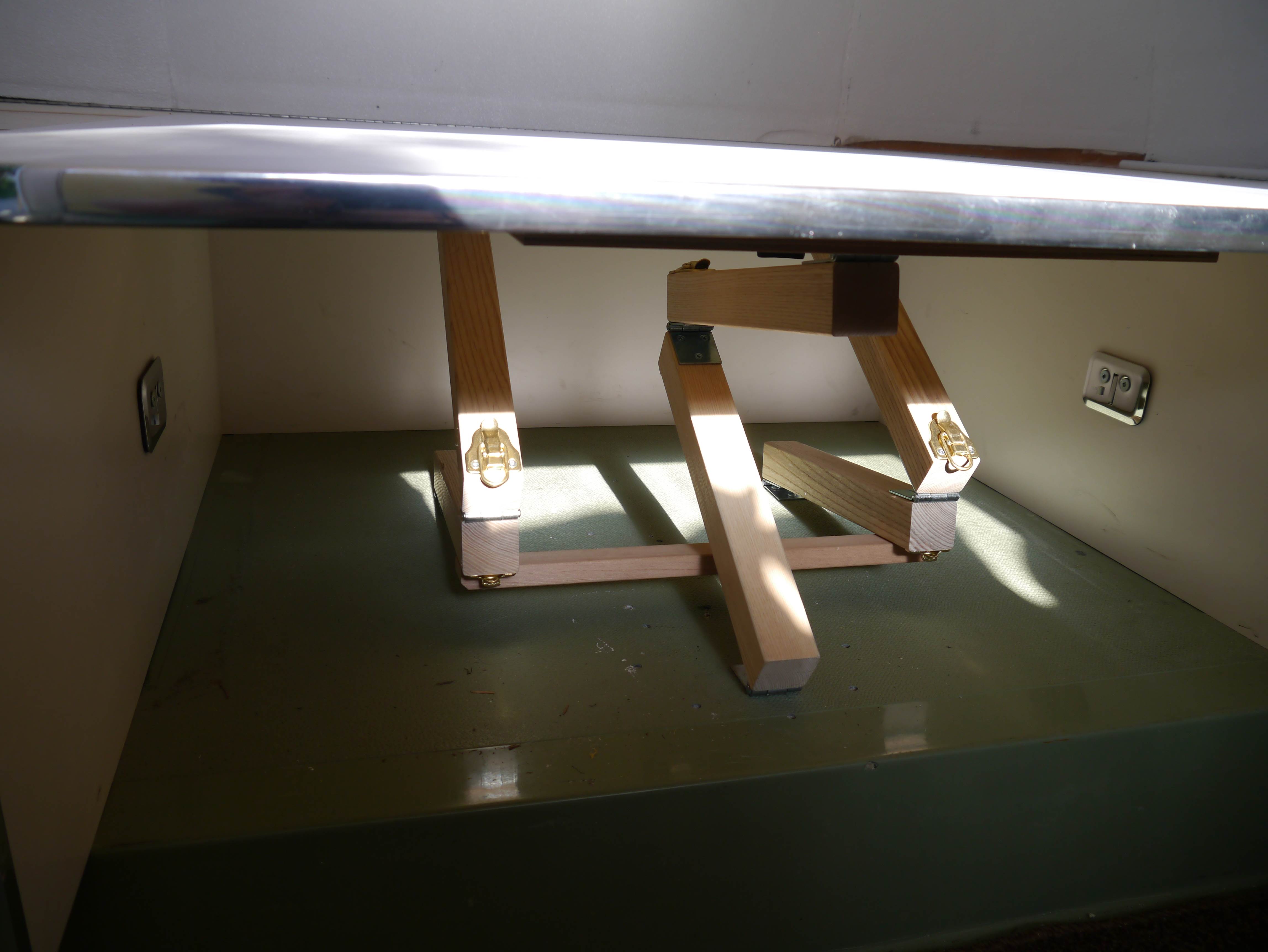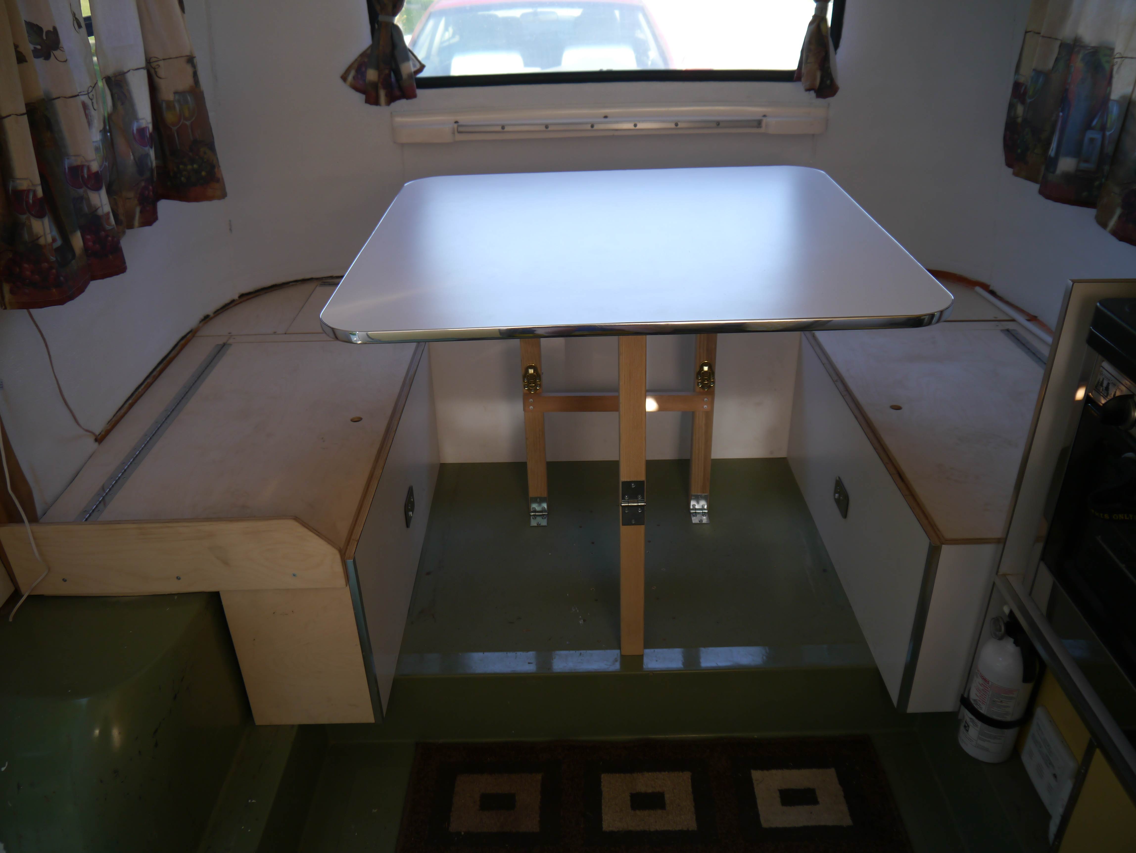 When I was building the interior of my 1974 Boler trailer the table leg design became an interesting evolution. I wanted a simple system that was easy to use since the table/bed would be converted back and forth quite often. I initially tried a single metal pedestal used by many RVs but found it to be very unstable, so if one pedestal is not enough I tried adding a second one, which is also common in many RV’s. The two pedestals made the table stable enough, but I found it very difficult to remove and lower the 34”x34” table by myself.